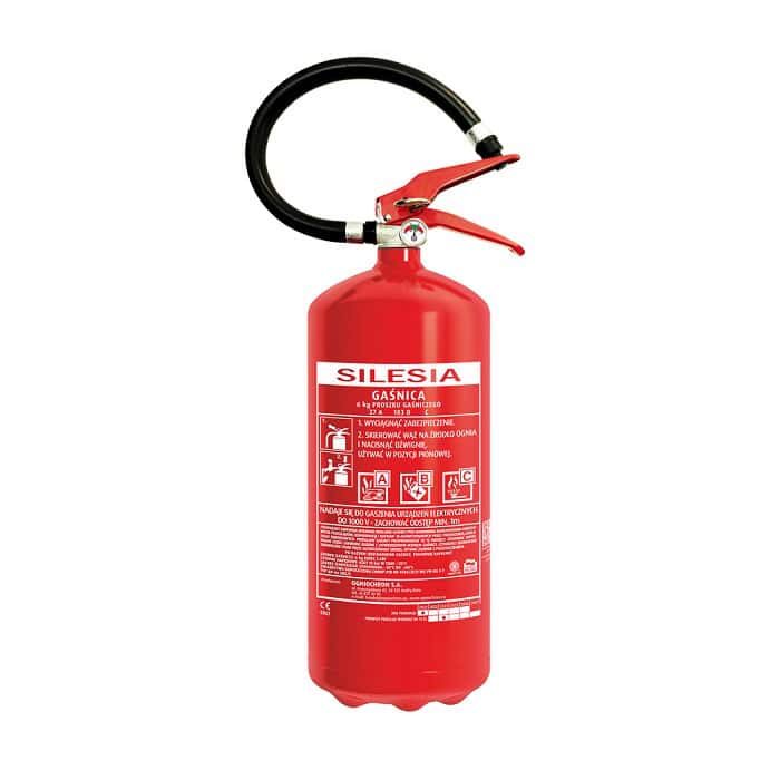 Gaśnica proszkowa 6 kg zaprojektowana dla zabezpieczenia obiektów użyteczności publicznej, pomieszczeń biurowych, produkcyjnych, magazynów, garaży. Znajduje również szczególne zastosowanie w energetyce, górnictwie podziemnym, transporcie kolejowym. Doskonale sprawdza się w transporcie samochodowym, kolejowym i wodnym. Znajdzie również zastosowanie jako gaśnica do kotłowni lub garażu. Łatwa w obsłudze, zapewnia szybkie i skuteczne gaszenie. Zawór odcinający i wskaźnik ciśnienia ułatwiający kontrolę i obsługę serwisową. Zawór skonstruowany tak, aby umożliwić czasowe przerwanie gaszenia. Zbiornik nie podlega kontrolnym badaniom UDT. Możliwość wielokrotnego napełniania. Zbiornik pokryty poliestrową farbą odporną na promieniowanie UV, wewnątrz powłoka antykorozyjna. Skuteczność gaszenia 27A 183B C, czas działania 15 s. Zakres temperatur stosowania -30OC – +60OC. Nadaje się do gaszenia urządzeń elektrycznych do 1000V. Może być stosowana w górnictwie (opinia CSRG nr 26/2008). Wyposażona w mocowania do zwieszania na wieszaku zaczepowym. Zgodna z ISO 9001. Spełnia wymagania normy europejskiej EN3 oraz Dyrektywy bezpieczeństwa PED 2014/68/UE. Produkt polski.