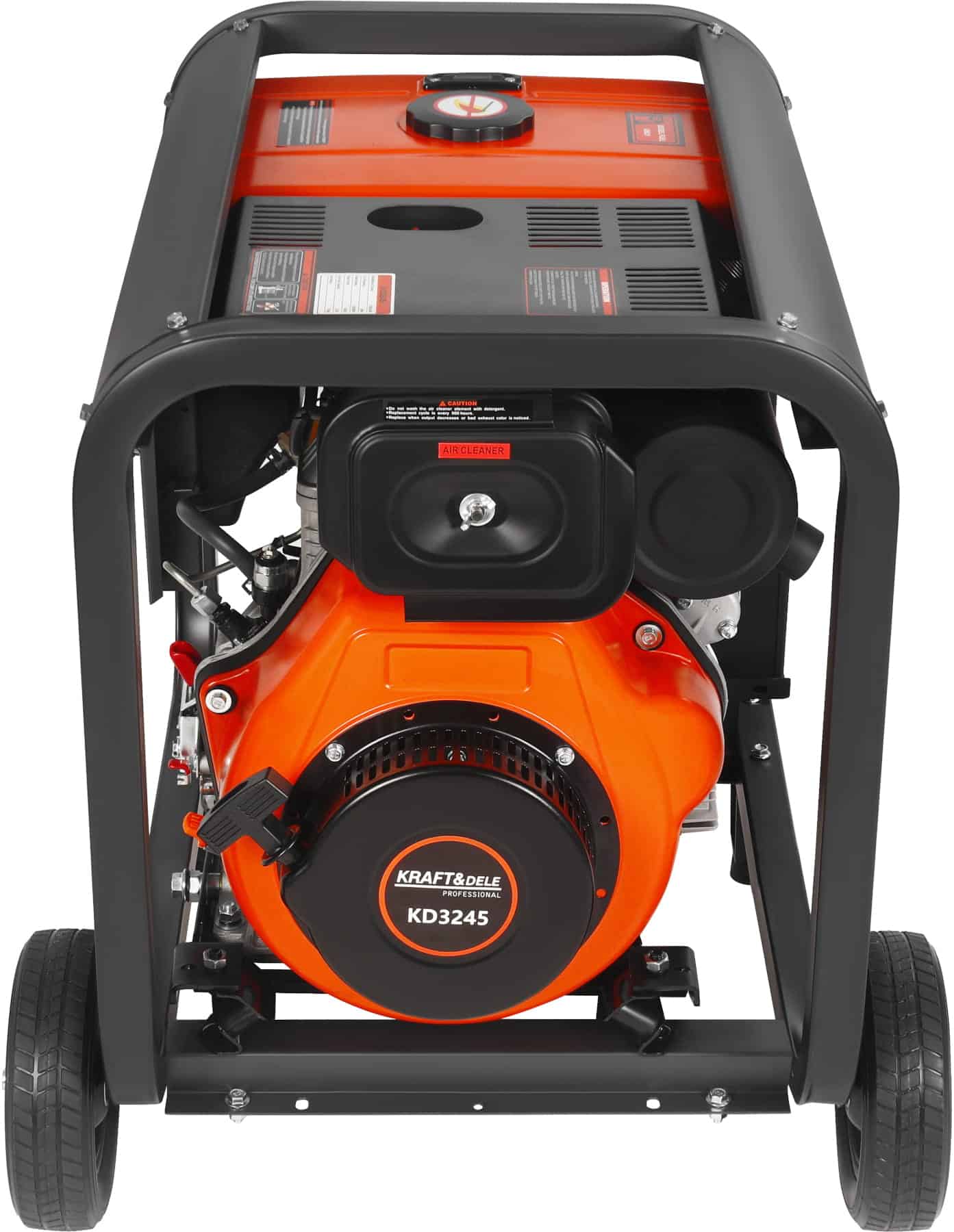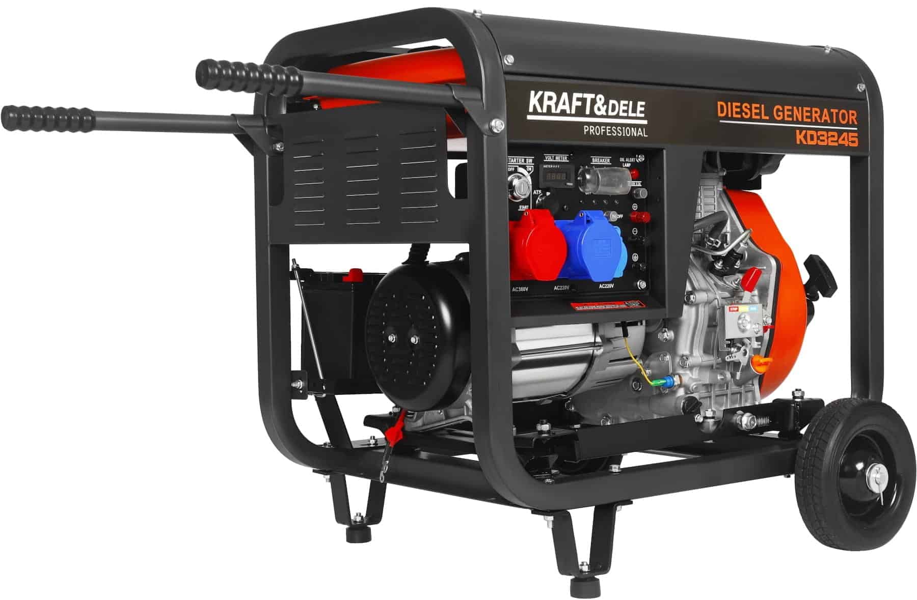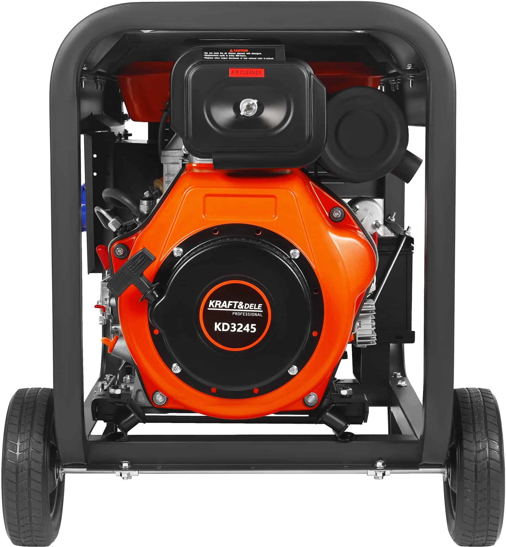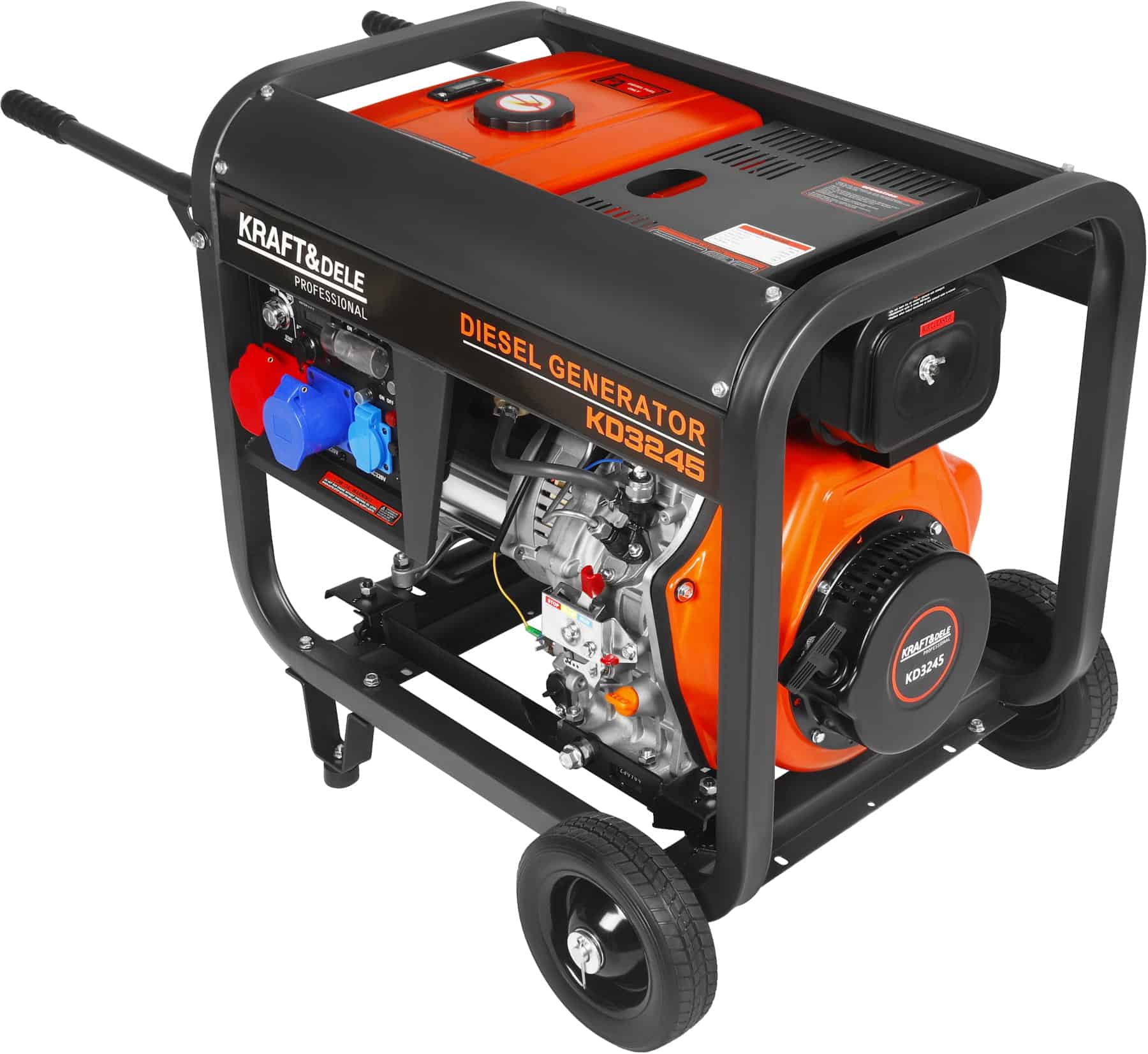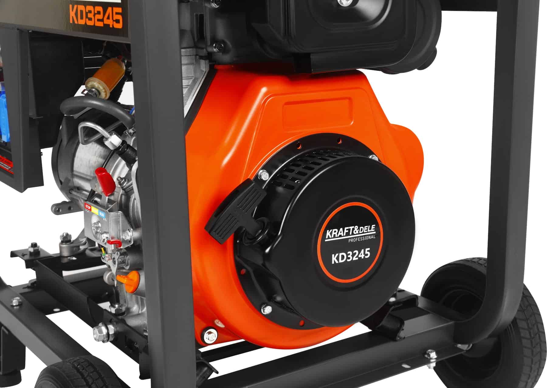 Model KD3245 oferuje gniazda 220V, 220V 32A, 400V oraz dodatkowe złącze 12V 8,3A, co zapewnia dużą elastyczność podłączeń. Wyposażony został w woltomierz, wyłącznik awaryjny oraz elektryczny system rozruchu. Silnik osadzony na poduszkach skutecznie ogranicza drgania, a duże koła transportowe i rozkładane rękojeści znacząco ułatwiają przemieszczanie agregatu. Całość zamknięta jest w stabilnej, stalowej ramie chroniącej osprzęt podczas pracy i transportu.
