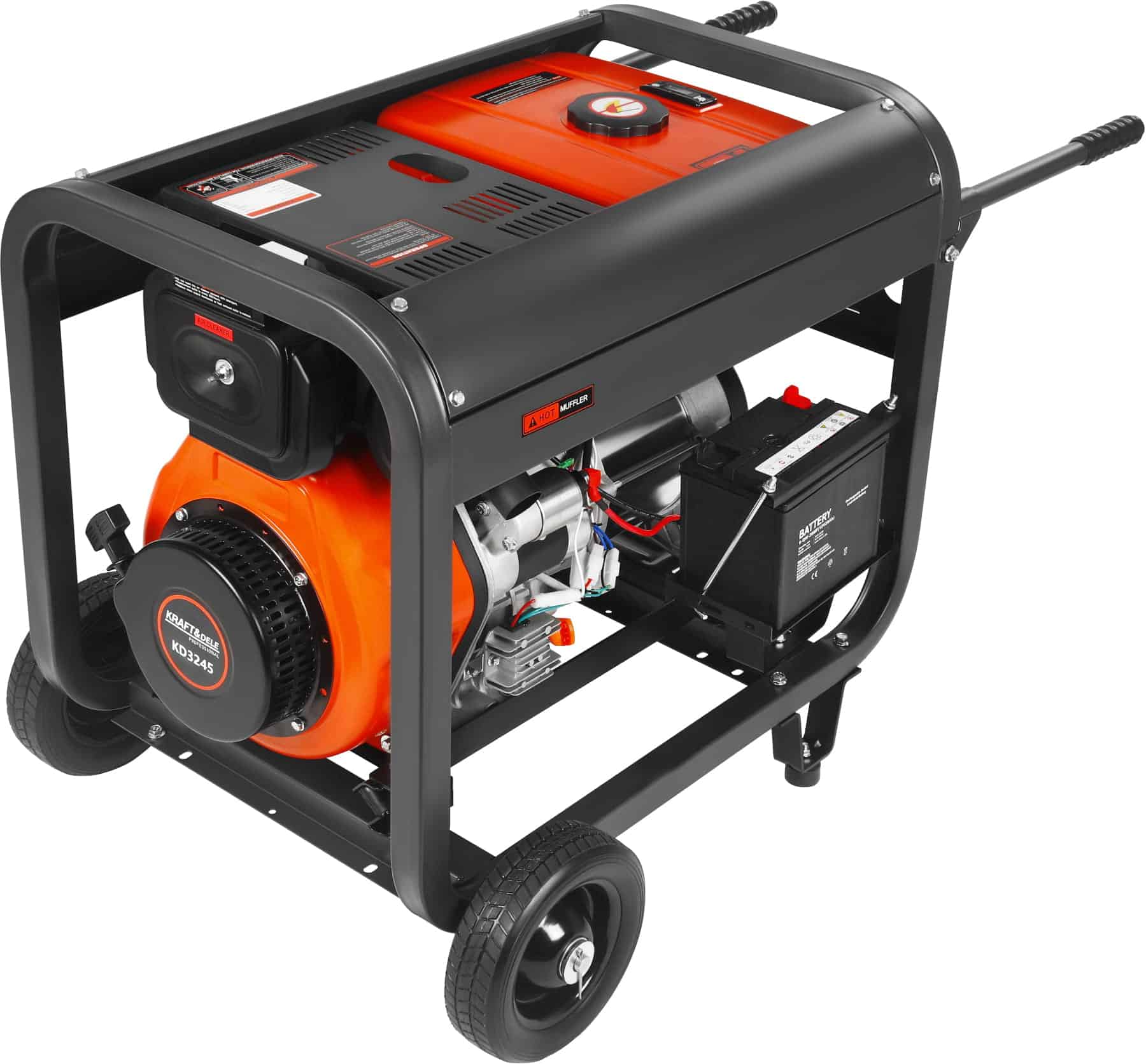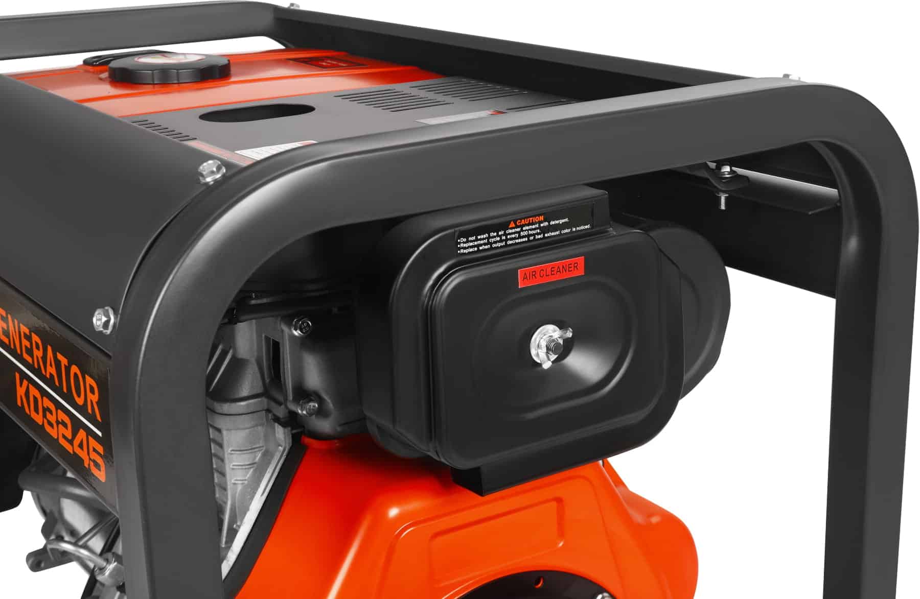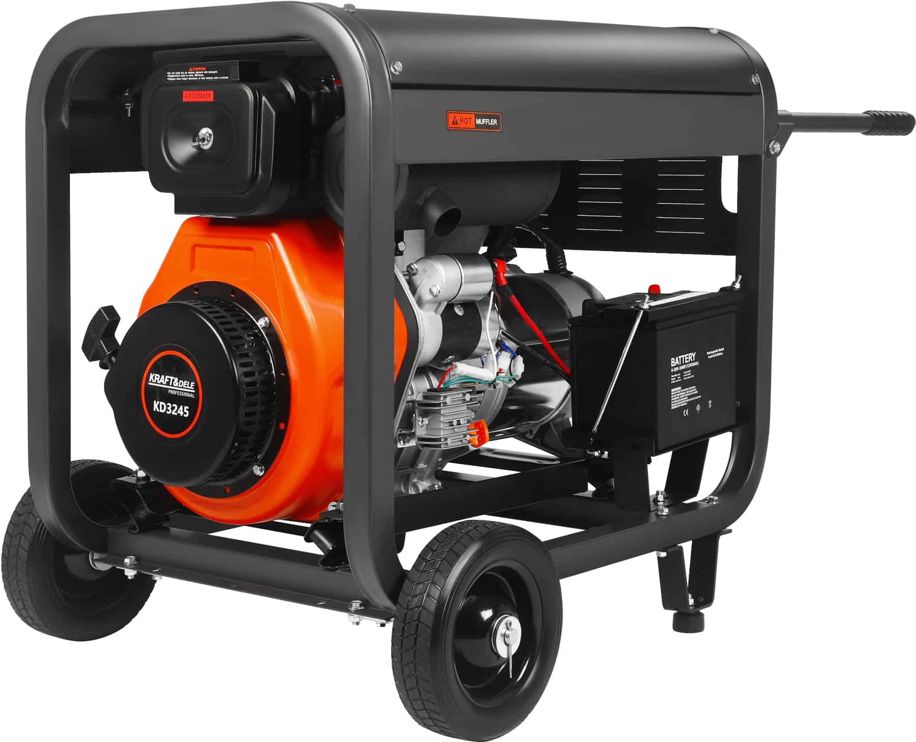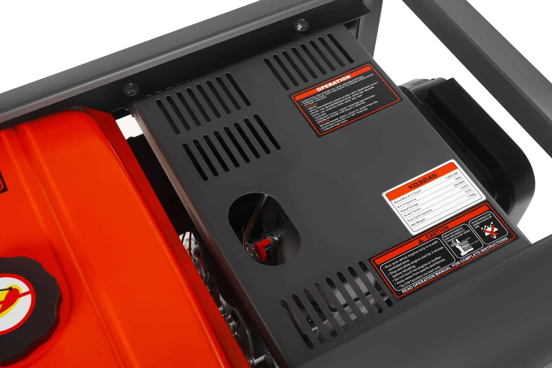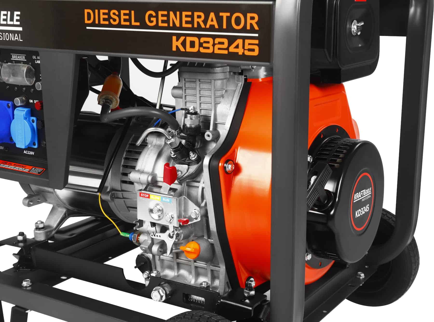 Model KD3245 oferuje gniazda 220V, 220V 32A, 400V oraz dodatkowe złącze 12V 8,3A, co zapewnia dużą elastyczność podłączeń. Wyposażony został w woltomierz, wyłącznik awaryjny oraz elektryczny system rozruchu. Silnik osadzony na poduszkach skutecznie ogranicza drgania, a duże koła transportowe i rozkładane rękojeści znacząco ułatwiają przemieszczanie agregatu. Całość zamknięta jest w stabilnej, stalowej ramie chroniącej osprzęt podczas pracy i transportu.