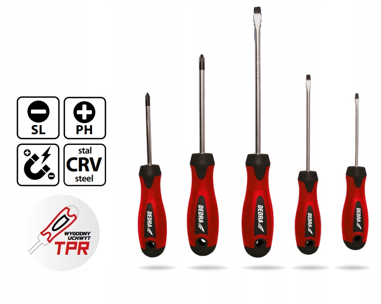Zestaw wkrętaków został wykonany z wysokiej jakości materiałów w tym ze stali chromowo wanadowej groty posiadają satynowe wykończenie, zabezpieczające przed korozją, ponadto końcówki grotów są dodatkowo piaskowane i namagnesowane co umożliwia pewny chwyt łba śruby. Rączka została wykonana z tworzywa sztucznego i pokryta gumową powłoką, która gwarantuje pewne trzymane w dłoni.