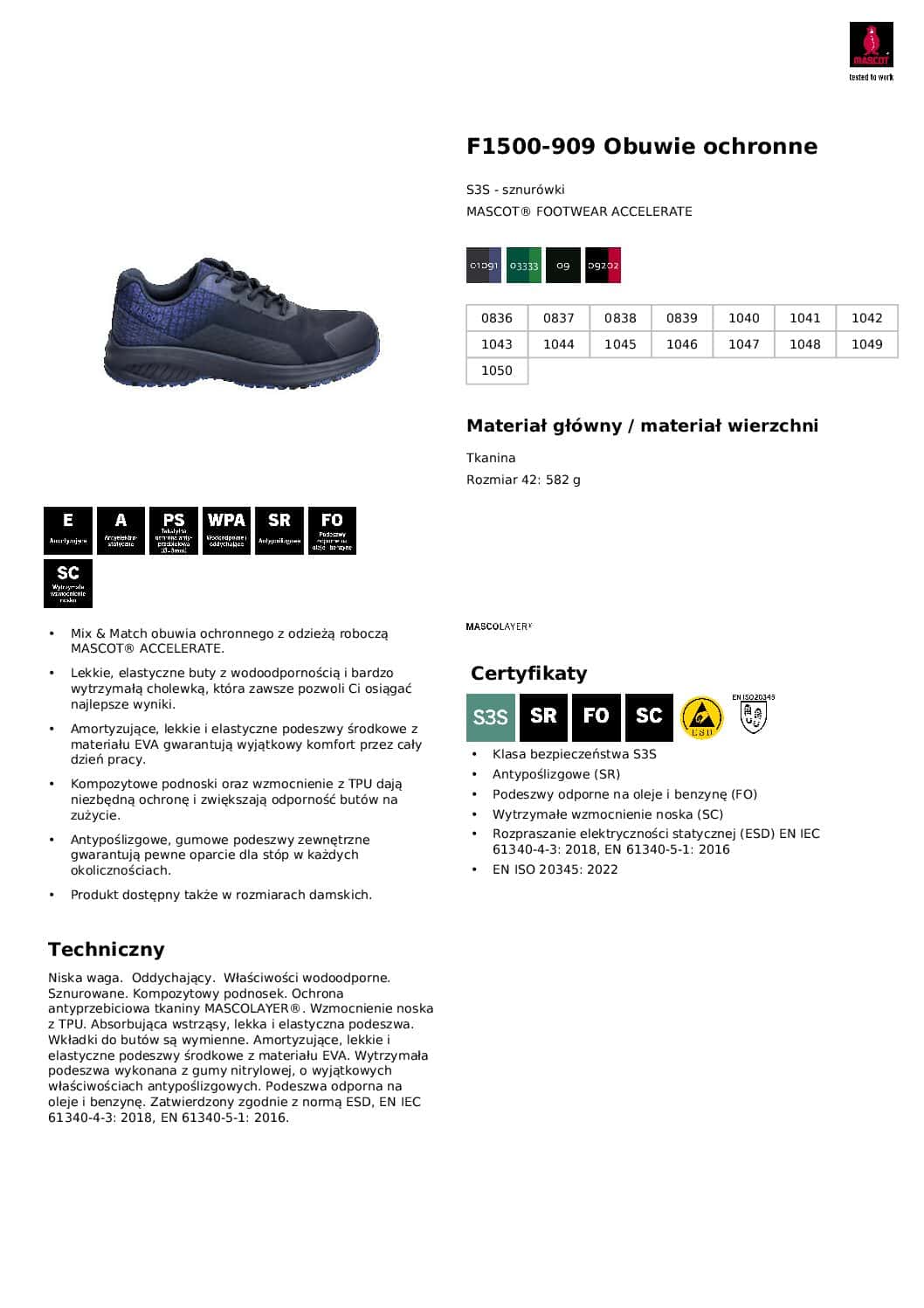 Buty robocze F1500-909-09 marki Mascot z serii Accelerate to nowoczesne obuwie ochronne zaprojektowane dla osób pracujących w dynamicznych warunkach. Model łączy lekkość, elastyczność i wysoką ochronę klasy S3S, co sprawia, że świetnie sprawdza się w codziennej pracy.