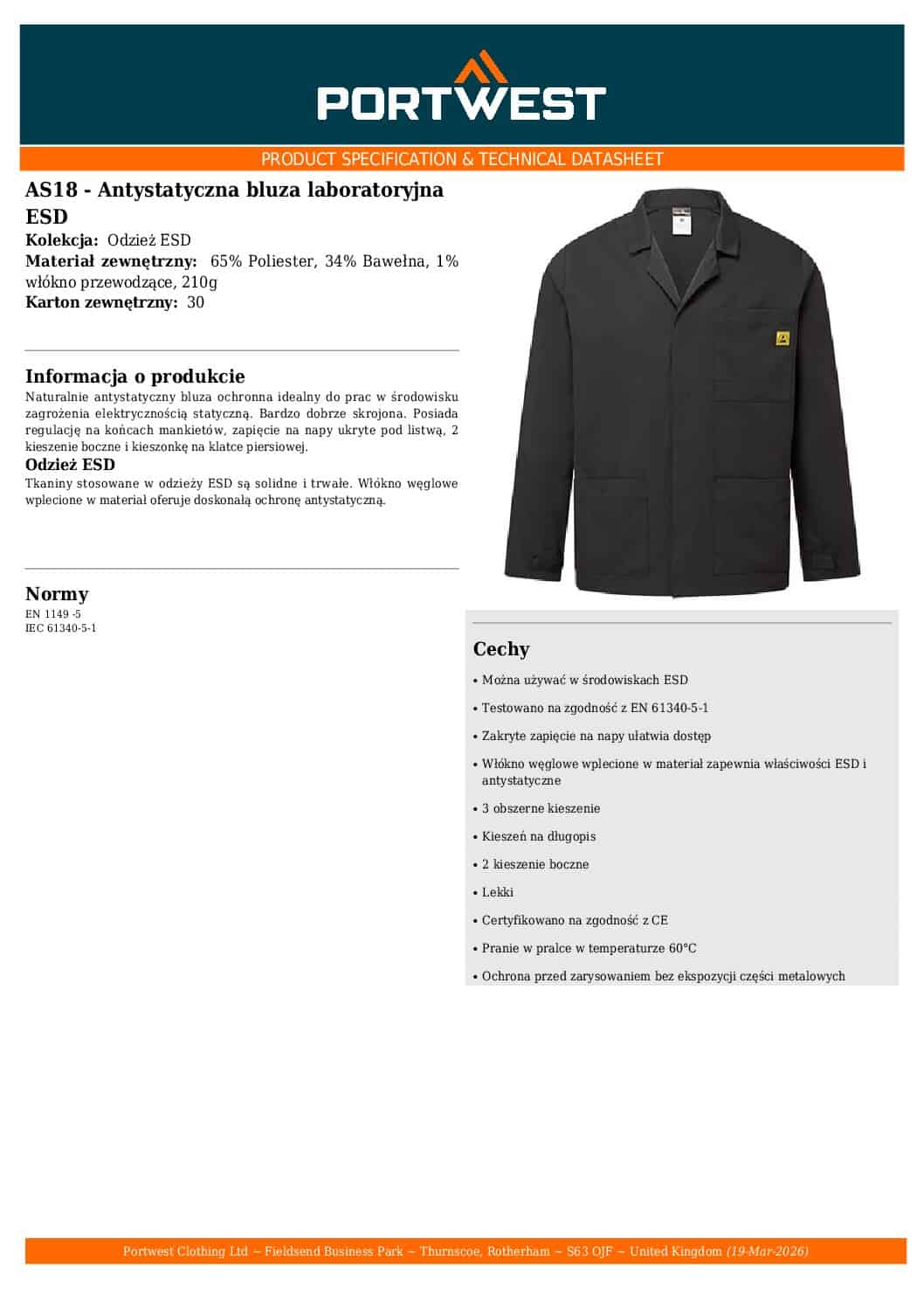 Antystatyczna bluza laboratoryjna ESD Portwest AS18 – profesjonalna ochrona w strefach EPA