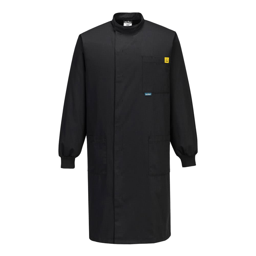 Antystatyczny fartuch ESD ma wiele sprytnych cech konstrukcyjnych. Posiada ściągacze w mankietach. Dwie dolne dodatkowe naszywane kieszenie zapewniają łatwe przechowywanie, a lewa kieszeń na klatce piersiowej posiada łatwy dostęp. Odzież jest chroniona wodoodpornym i odpornym na zabrudzenia wykończeniem Texpel.