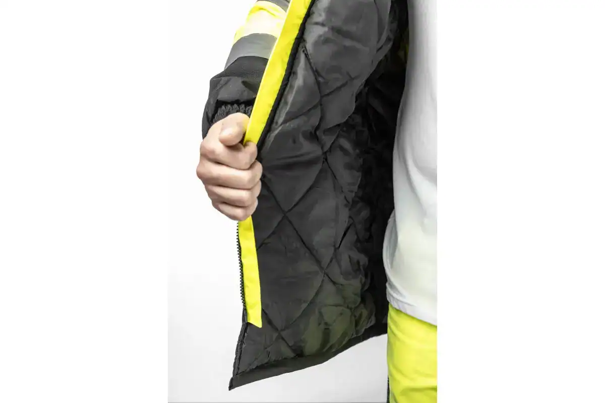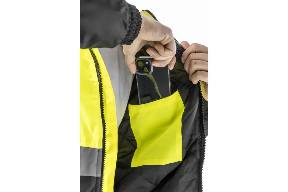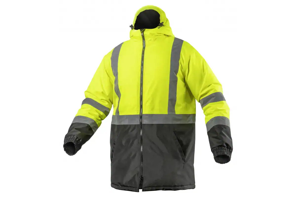 Nowoczesna, ocieplana męska kurtka ostrzegawcza typu parka. Posiada dwie taśmy odblaskowe dookoła barków i rękawów oraz jedną taśmę dookoła tułowia. Starannie wykonana z najwyższej jakości materiałów. Zapewnia maksymalny komfort oraz ochronę przed zimnem i wiatrem. Chroni również przed deszczem (wodoodporność na poziomie 2000 mm H2O). Zwiększa bezpieczeństwo podczas przebywania w warunkach ograniczonej widoczności np. w trakcie przemieszczania w nocy oraz podczas złych warunków pogodowych np. w czasie deszczu lub mgły. Szczególnie polecana w okresie jesiennym i zimowym.