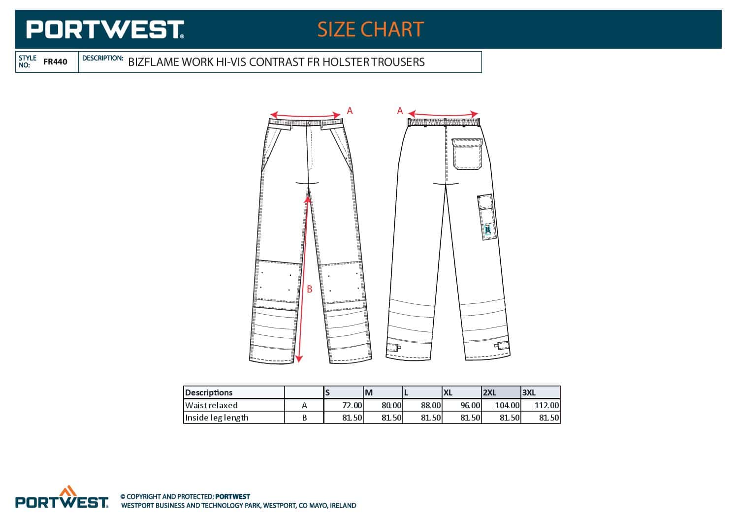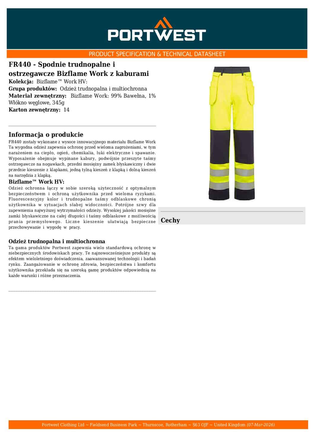FR440 zostały wykonane z wysoce innowacyjnego materiału Bizflame Work Ta wygodna odzież zapewnia ochronę przed wieloma zagrożeniami, w tym narażeniem na ciepło, ogień, chemikalia, łuki elektryczne i spawanie. Wyposażenie obejmuje wypinane kabury, podwójnie przeszyte taśmy ostrzegawcze na nogawkach, przedni mosiężny zamek błyskawiczny i dwie przednie kieszenie z klapkami, jedną tylną kieszeń z klapką i dolną kieszeń na narzędzia z klapką.