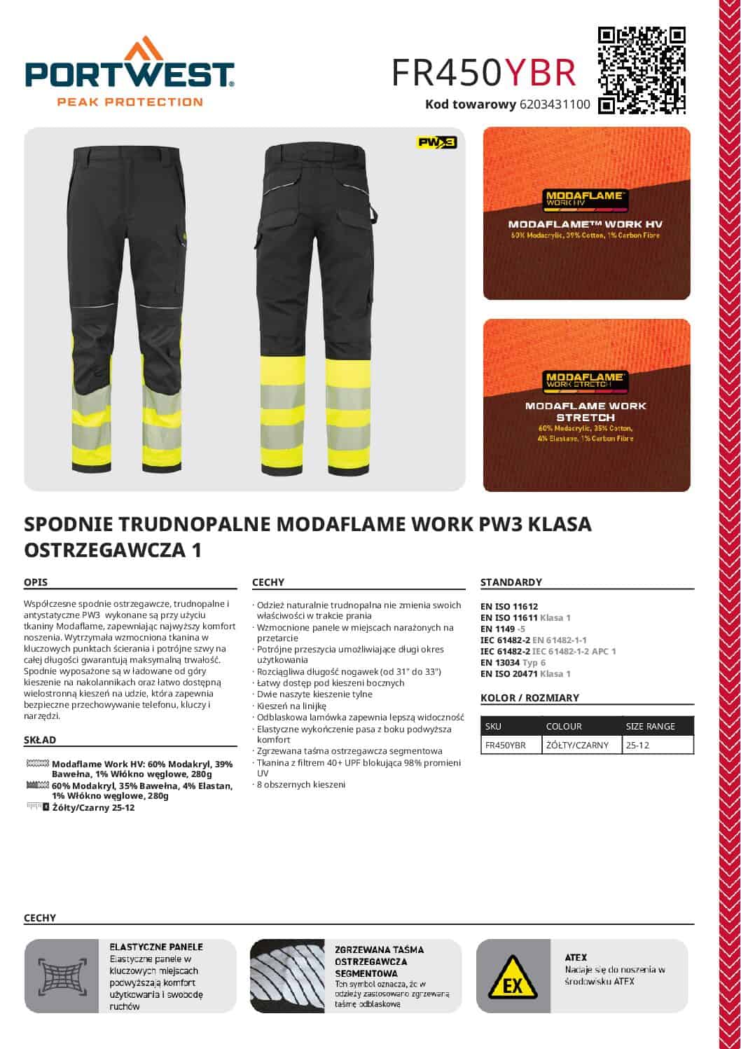 Współczesne spodnie ostrzegawcze, trudnopalne i antystatyczne PW3 wykonane są przy użyciu tkaniny Modaflame, zapewniając najwyższy komfort noszenia. Wytrzymała wzmocniona tkanina w kluczowych punktach ścierania i potrójne szwy na całej długości gwarantują maksymalną trwałość. Spodnie wyposażone są w ładowane od góry kieszenie na nakolannikach oraz łatwo dostępną wielostronną kieszeń na udzie, która zapewnia bezpieczne przechowywanie telefonu, kluczy i narzędzi.