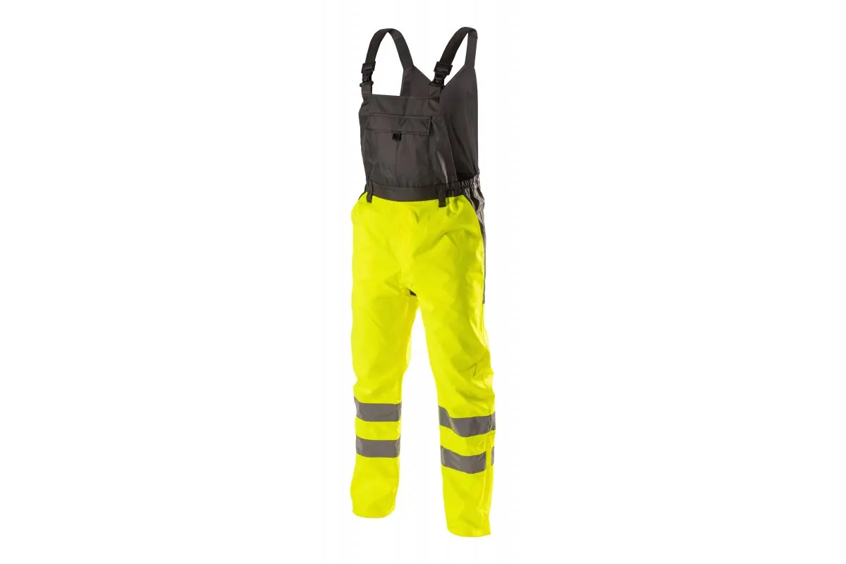 Męskie ogrodniczki ostrzegawcze przeciwdeszczowe wykonane z najwyższej jakości materiałów. Wyróżniają się lekkością i przepuszczalnością powietrza, zapewniają maksymalny komfort noszenia. Chronią przed deszczem (wodoodporność na poziomie 2000 mm H2O) i wiatrem. Zwiększają bezpieczeństwo podczas przebywania w warunkach ograniczonej widoczności np. w trakcie przemieszczania w nocy oraz podczas złych warunków pogodowych np. w czasie deszczu lub mgły. Kolorystyka produktu jest skierowana do branż, w których pracownicy muszą być widoczni, między innymi do osób budujących drogi, ulice, rafinerie, pracujących w portach, na platformach wiertniczych, szybach wydobywczych, lotniskach czy w ratownictwie górskim.