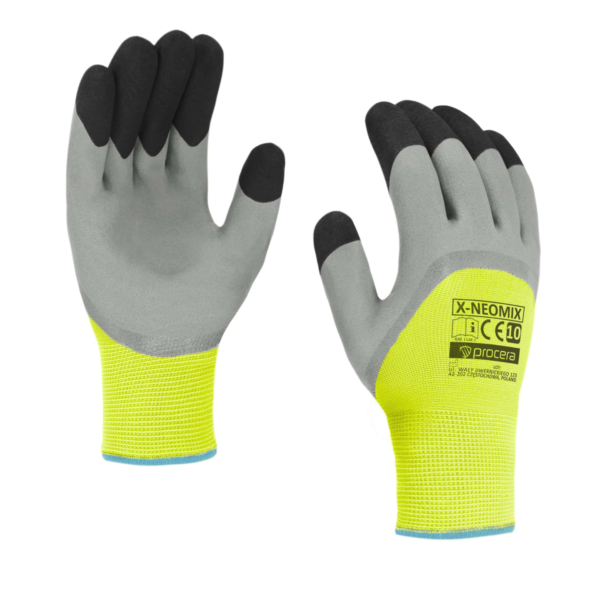Rękawice ochronne PROCERA X-NEOMIX to rękawice przeznaczone do prac montażowych, magazynowych i w wielu innych środowiskach, gdzie liczy się trwałość oraz pewny chwyt. Wykonane z 13-ściegowej dzianiny poliestrowej zapewniają dobre dopasowanie do dłoni i wysoki komfort użytkowania. Część chwytna została powleczona gładkim lateksem w systemie 3/4, co zwiększa odporność na ścieranie i poprawia przyczepność podczas pracy z narzędziami oraz elementami metalowymi. Dodatkowe wzmocnienie w postaci czarnej pianki lateksowej na końcówkach palców podnosi trwałość rękawic w najbardziej eksploatowanych miejscach. Neonowy, elastyczny mankiet stabilizuje rękawicę na nadgarstku poprawiając ergonomię użytkowania. Model X-NEOMIX to uniwersalne rękawice ochronne dedykowane dla wielu branż. EN21420:2020. Rozmiary: 9,10. Pakowanie 12/240.