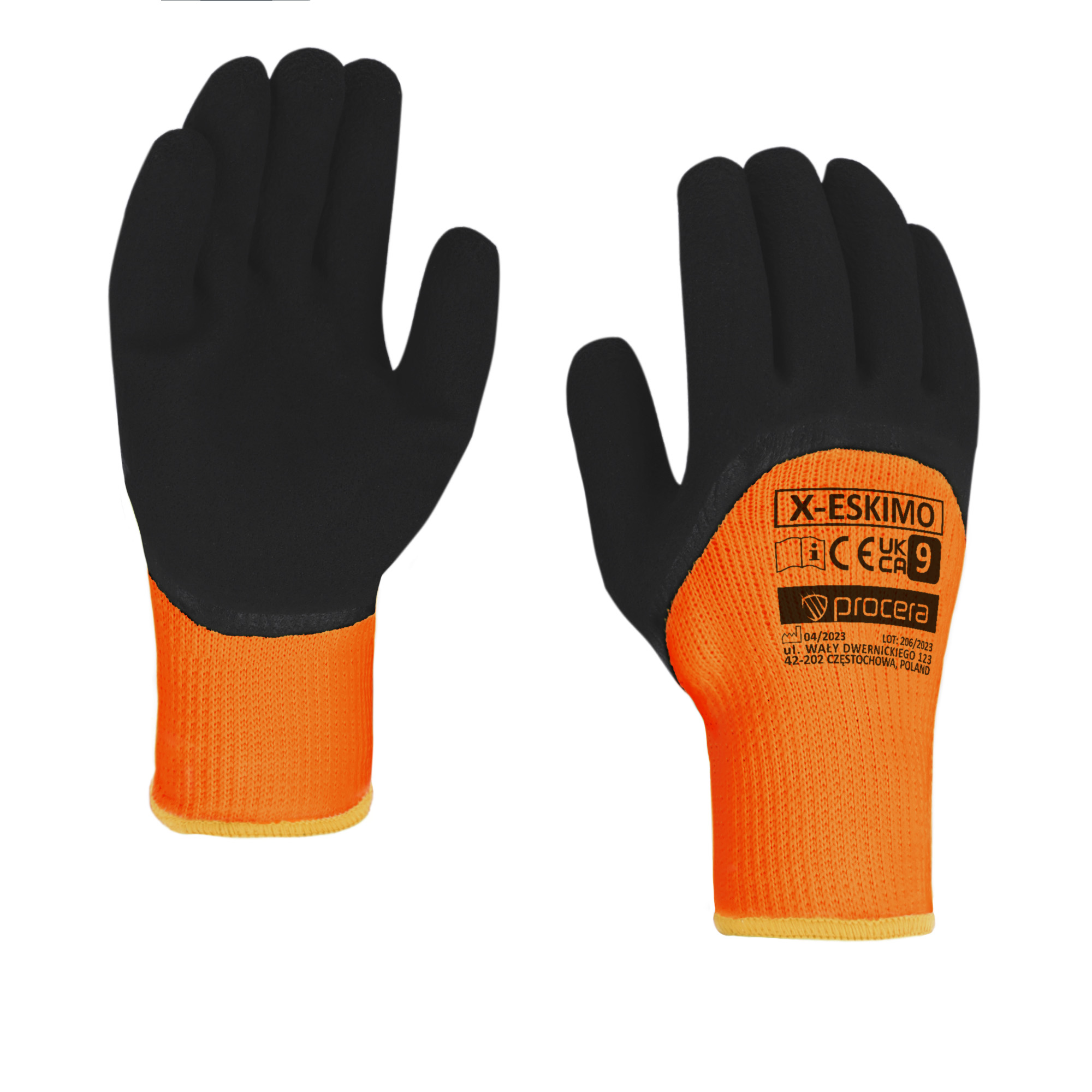 Rękawice X-ESKIMO wykonane z ocieplanej dzianiny poliestrowo bawełnianej w kolorze pomarańczowym, powlekanej pianką lateksową w części chwytnej oraz całe palce w części grzbietowej. Pianka w kolorze czarnym lub brązowym. Idealne do prac manualnych w niskich temperaturach. Bardzo dobra przyczepność. Duża wytrzymałość na ścieranie. Zakończone ściągaczem. CE EN 21420:2020. Opakowanie: karton 12/120. Kolor: pomarańczowy/brązowy.
