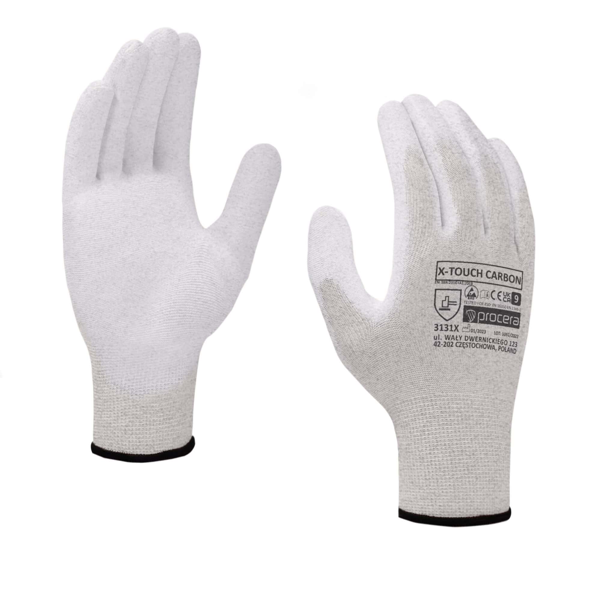 Rękawice X-TOUCH CARBON wykonane z przędzy nylonowej z dodatkiem włókien węglowych, powlekane w części chwytnej poliuretanem. Antyelektrostatyczne, właściwości ESD. Idealne do prac manualnych, szczególnie przy częściach elektronicznych Bardzo dobre czucie trzymanego przedmiotu. Dobrze dopasowują się do kształtu dłoni. Zakończone ściągaczem. CE EN 388 , EN420 , EN16350. Pakowanie: karton 12/240.