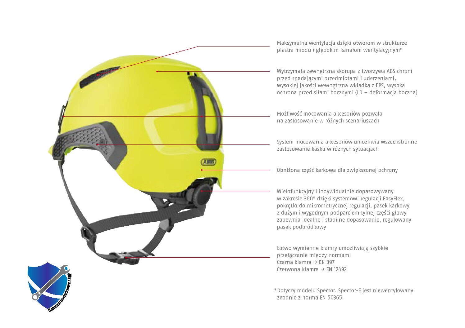 • Kask ochronny Spector chroni przed spadającymi, kołyszącymi się lub przewracającymi się przedmiotami i obiektami, a także przed urazami spowodowanymi uderzeniami, wstrząsami bocznymi lub czołowymi. Zamknięty wariant Spector-E chroni również przed zagrożeniami termicznymi i elektrycznymi.