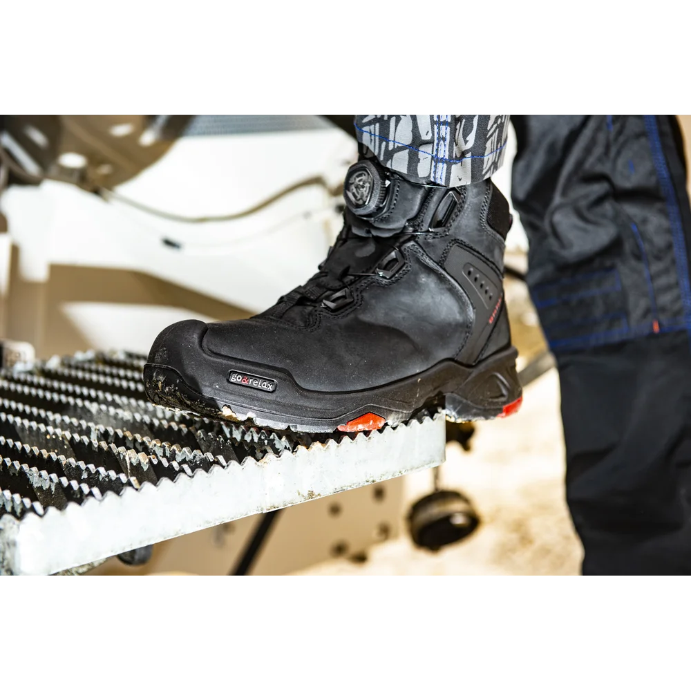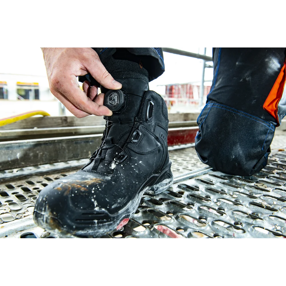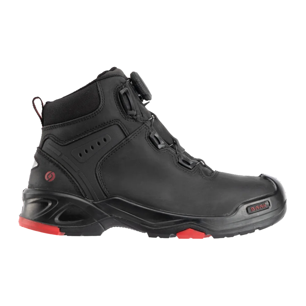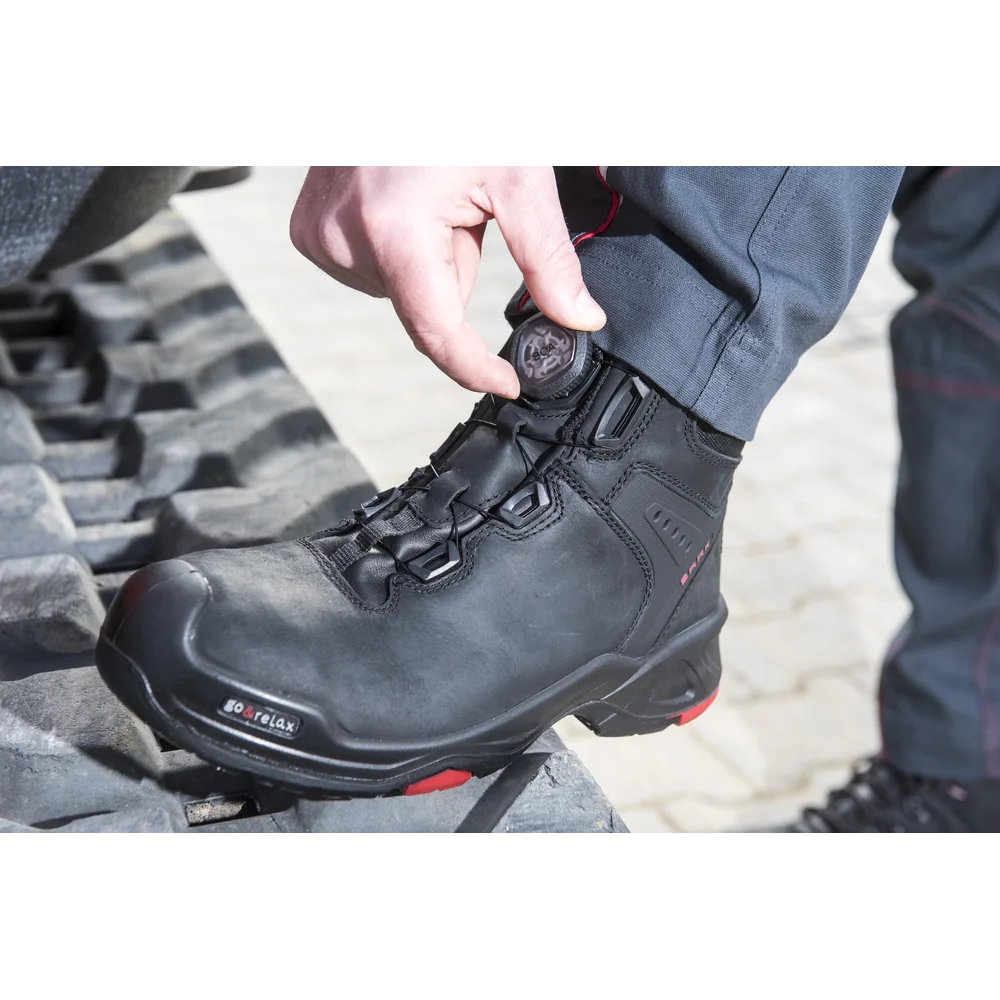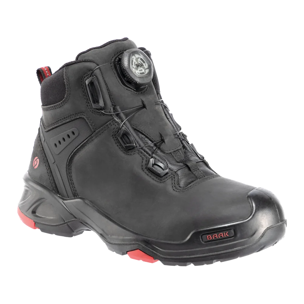Trzewiki ochronne Braxton, art. 6642; DIN EN ISO 20345:2011 S3 HI HRO SRC z systemem Boa®Fit; norma DGUV 112-191; pełnoziarnista skóra bydlęca, system bezpieczeństwa pięty; podszewka tekstylna; nakładka z PU; wkładka Baak ESD softstep+; system Baak®Go&Relax zapewniający wygodę zginania; podeszwa z PU/gumy ze strefą flex Baak; stalowa nakładka flex i element łączący H; ochrona przed przebiciem z materiału tekstylnego; rozmiar 38-48, szerokość 11