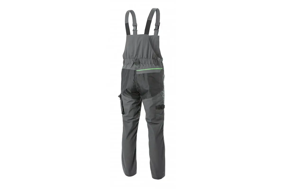 Starannie wykonane męskie ogrodniczki ochronne. Wysokiej jakości materiały i mocny splot zapewniają wytrzymałość i wysoki komfort użytkowania. Techniczny krój nie ogranicza ruchów. Zastosowane detale odblaskowe pozwalają zwiększyć bezpieczeństwo pracy po zmroku. Ogrodniczki dostępne są w modnym ciemnoszarym kolorze z zielonymi akcentami i szerokiej gamie rozmiarów (od S do 3XL). Idealne dla pracowników produkcyjnych oraz budowalnych. Polecane również monterom, serwisantom oraz technikom.