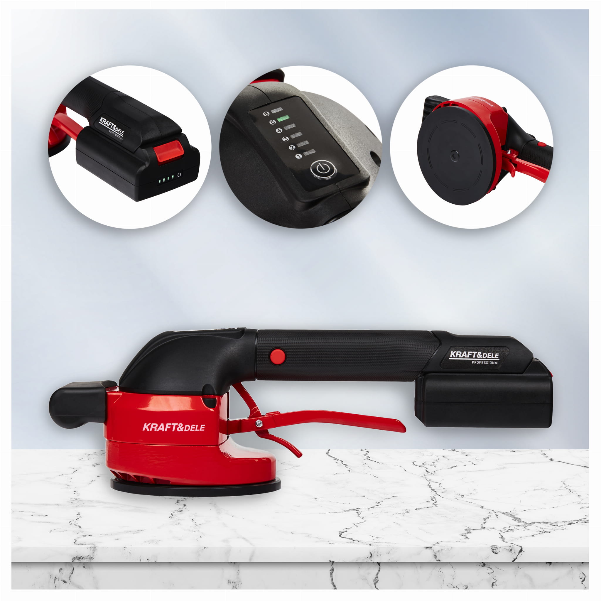 Bezprzewodowa przyssawka wibrująca do układania płytek polskiej marki Kraft&Dele model KD10792. Umożliwia łatwe ustawienie płytek poprzez przyssawkę, z możliwością podniesienia obiektów o wadze do 50 kg. Dodatkowo, dzięki funkcji wibracji, usuwa ona resztkowe pęcherzyki powietrza, które mogą prowadzić do potencjalnych pęknięć, zapewniając tym samym solidne i trwałe połączenie płytki z podłożem.