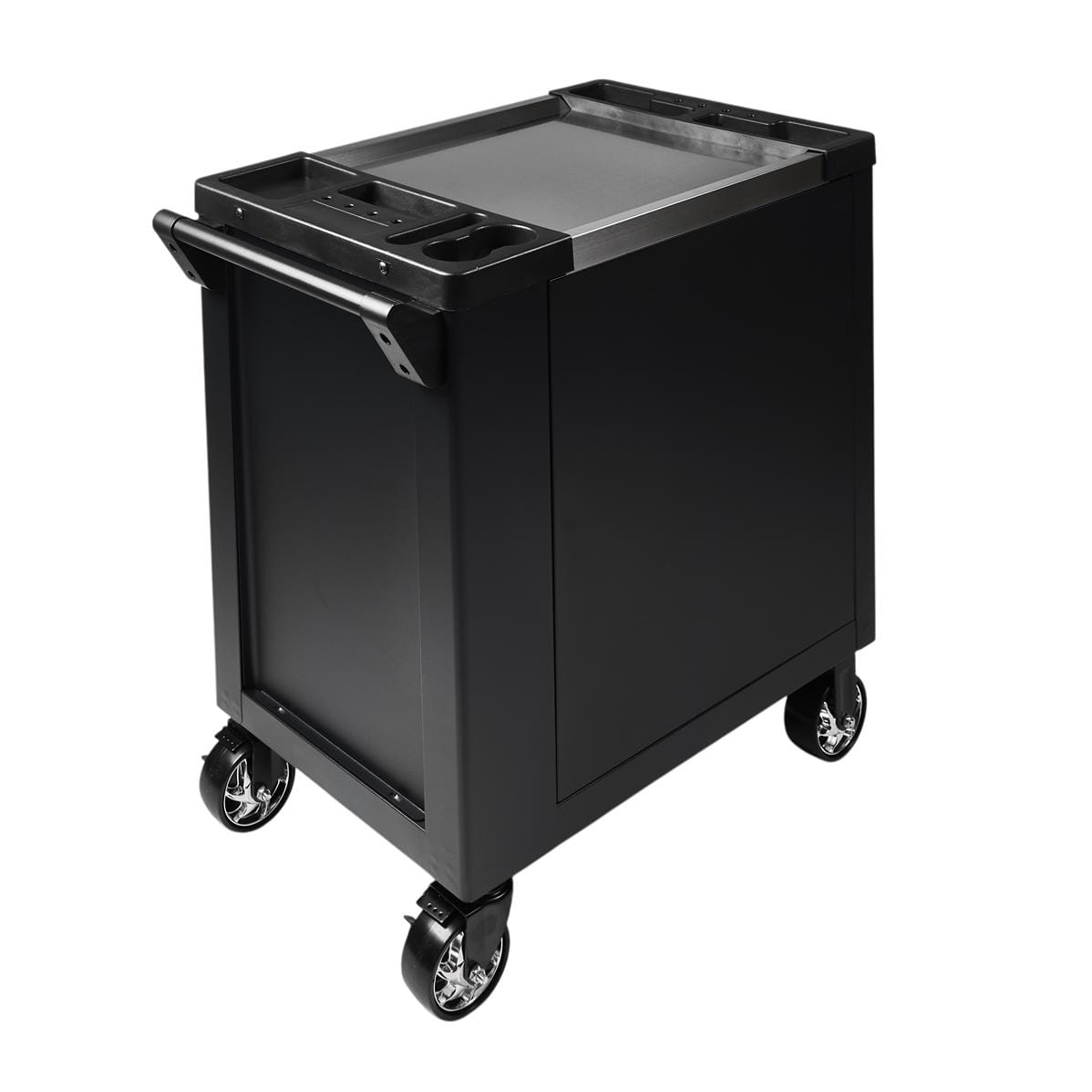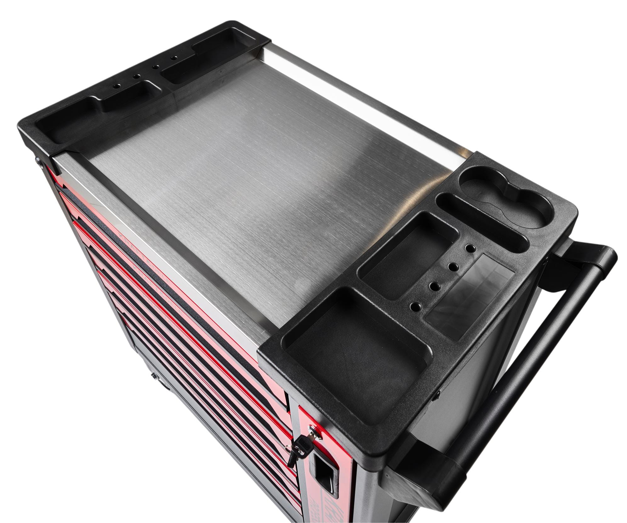 Blat wózka wykonany ze stali, odpornej na środki chemiczne, wysoką temperaturę oraz uszkodzenia. Po obu stronach blatu mamy otwory na wkręty, śróbki a nawet na kubek z pyszną kawą.