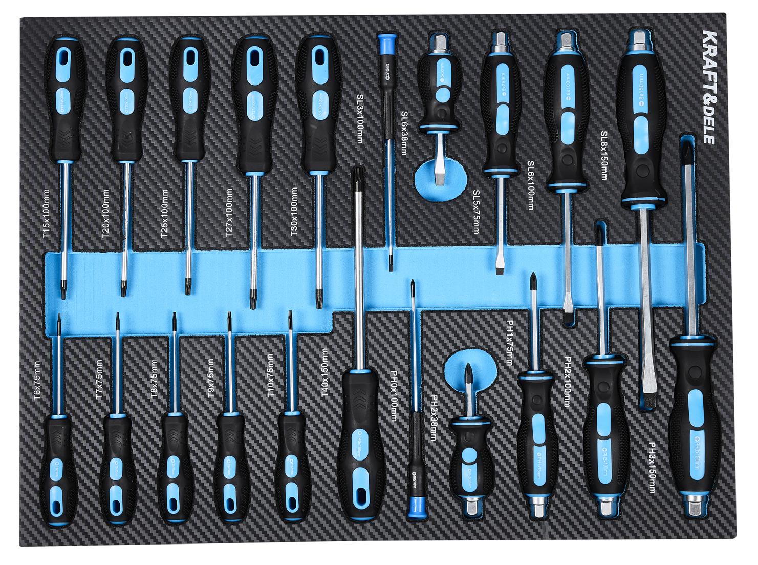 4 wkrętaki płaskie do pobijania – SL8‑SL6‑SL5 2 wkrętaki precyzyjne – PH0, SL3 11 wkrętaków typu torx – T6‑T40 |