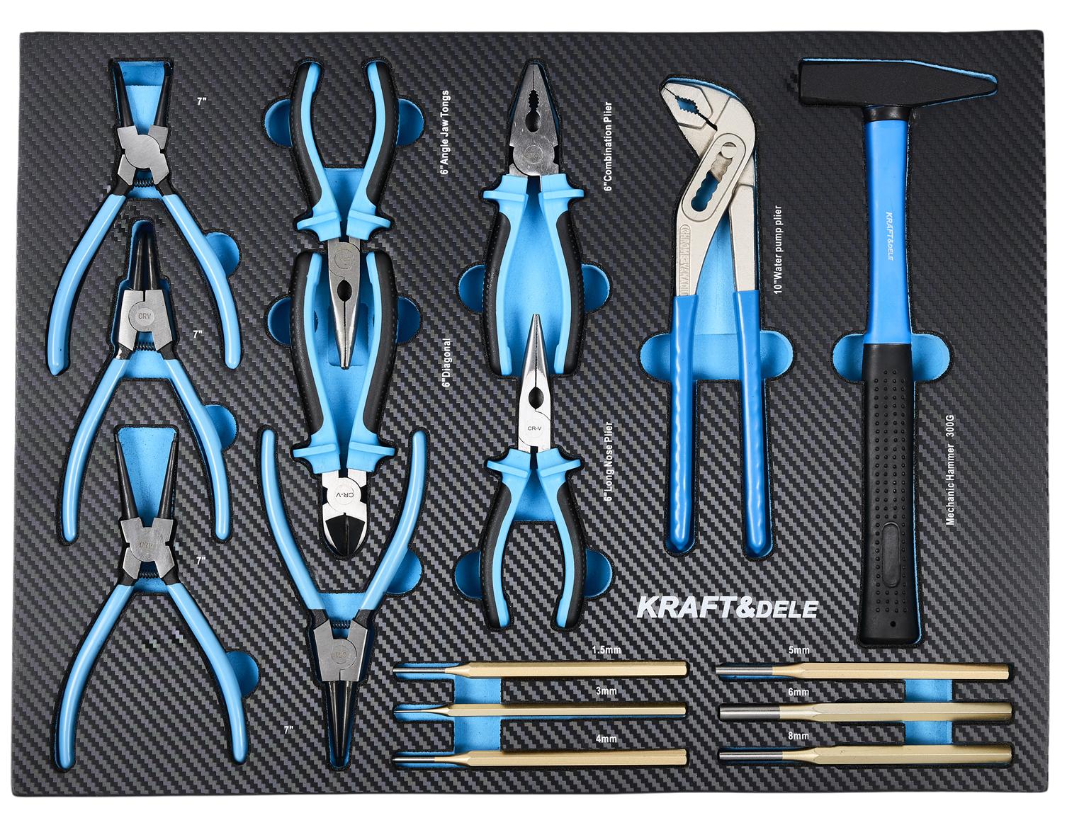 Kombinerki, szczypce wydłużone/uniwersalne – 160 mm Szczypce uniwersalne nastawne – 250 mm Młotek warsztatowy – 300 g Wybijaki walcowe 6 szt. – różne rozmiary |