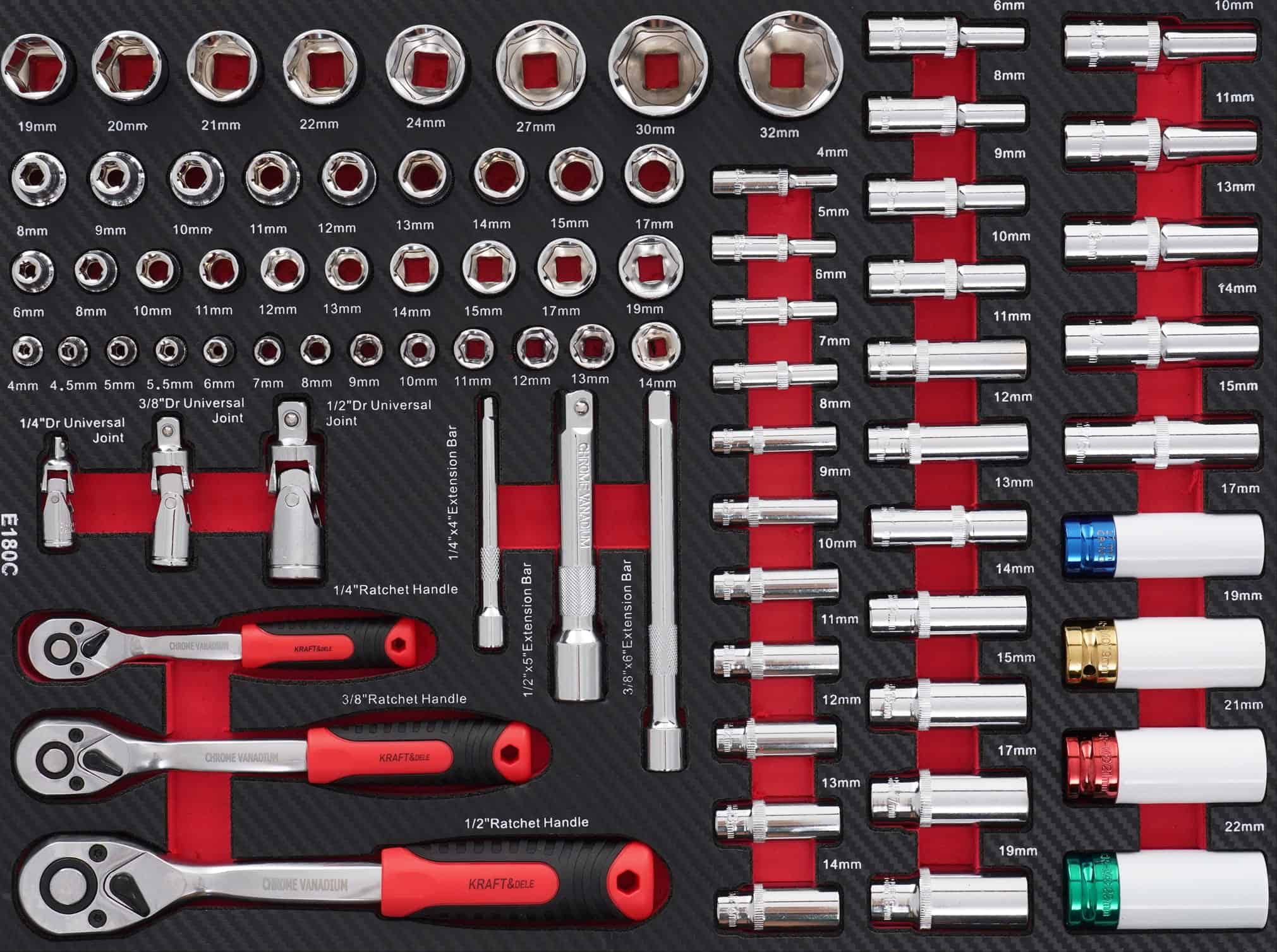 - ✔️ Zestaw 17 szt nasadek ½” w rozmiarach: 8/9/10/11/12/13/14/15/16/17/19/21/22/24/27/30/32 mm