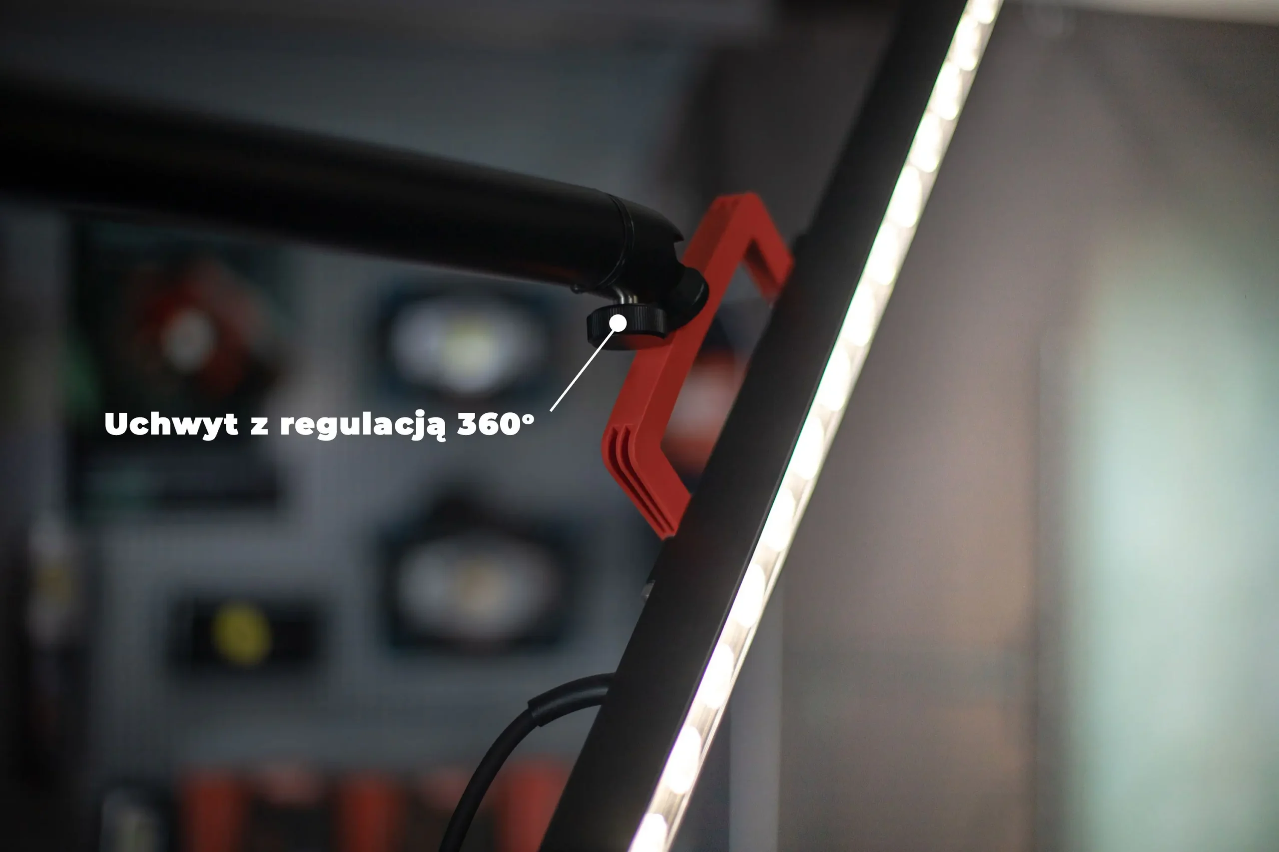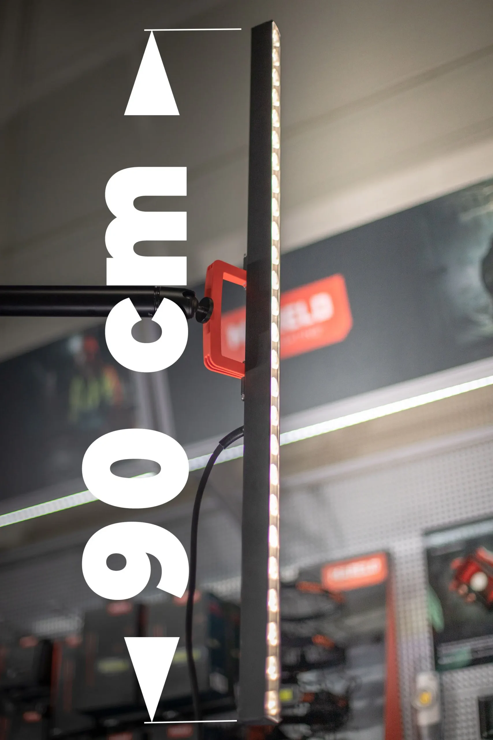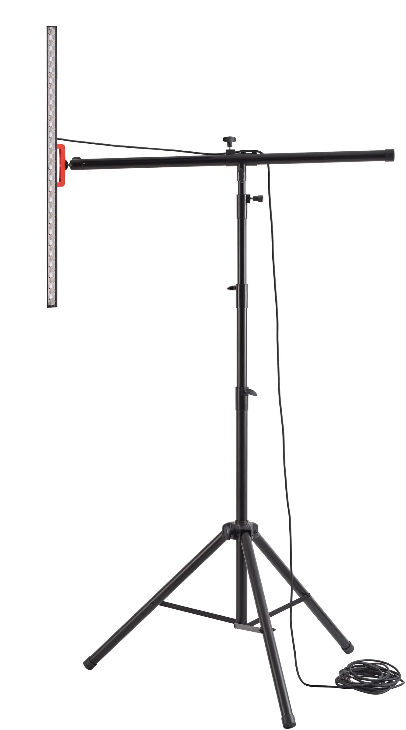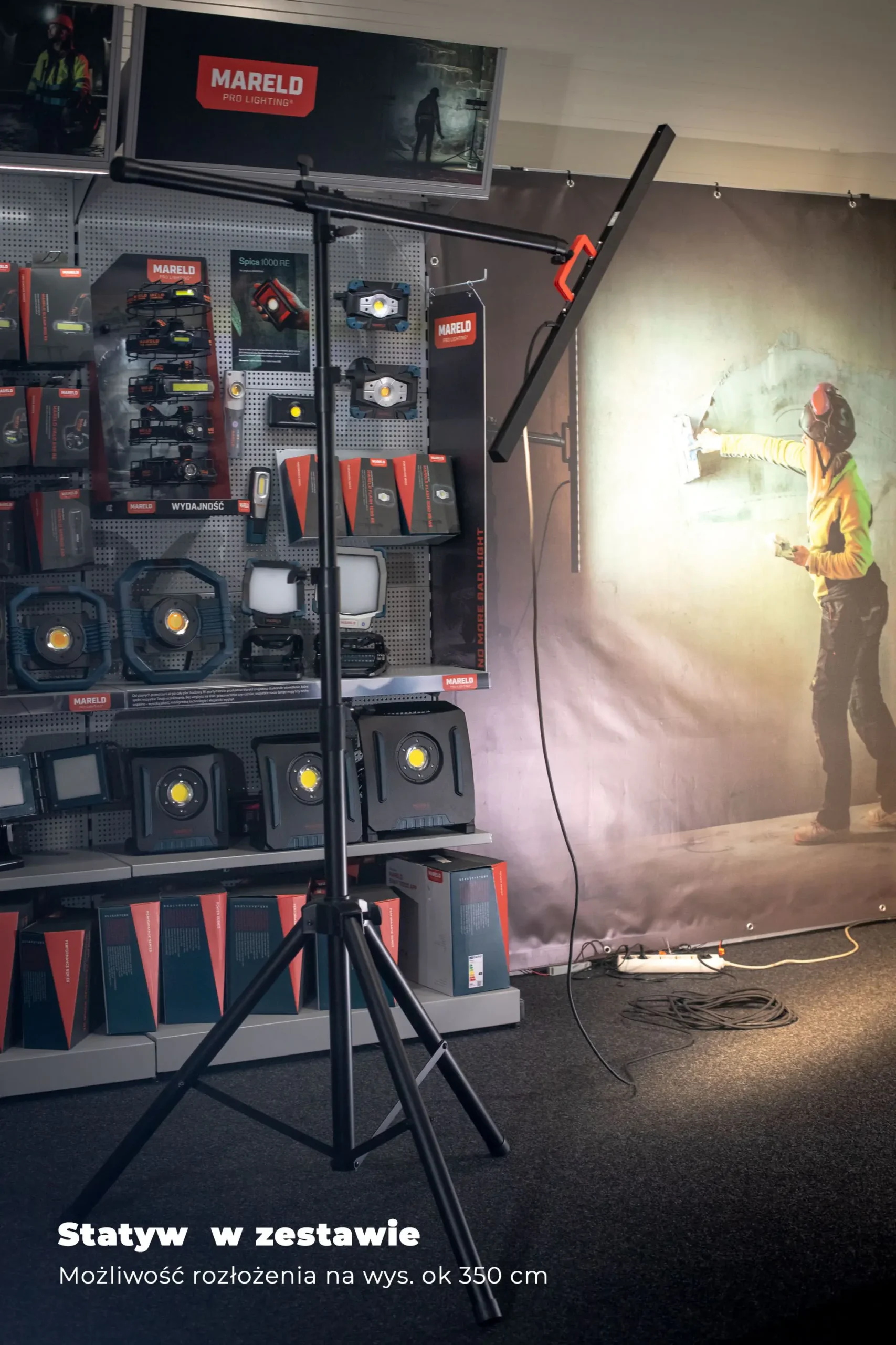 Lampa dostarczana jest ze statywem (możliwość rozłożenie do ok.350 cm wysokości) i wyposażona w wygodny w użyciu uchwyt.