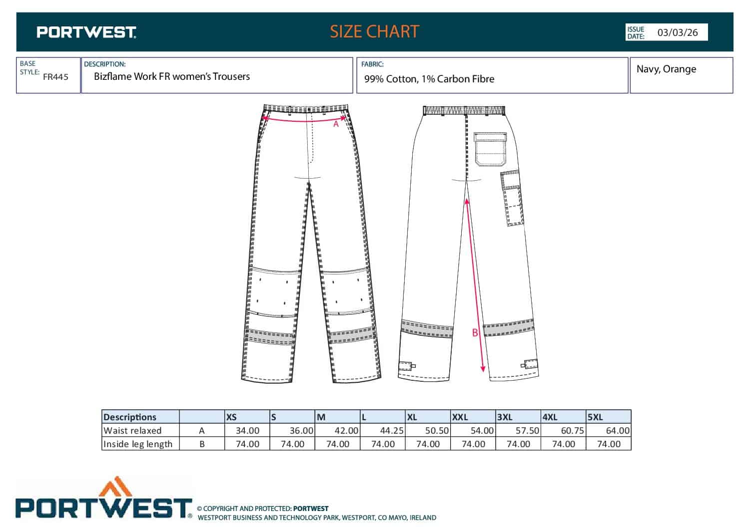 Spodnie damskie posiadające przyszyte podwójnym ściegiem taśmy odblaskowe. Cechy produktu obejmują potrójne szwy, odblaskowe taśmy na nogawkach, kieszenie na nakolanniki, kieszeń na linijkę, mosiężny zamek błyskawiczny z przodu i regulowaną szerokość nogawek.