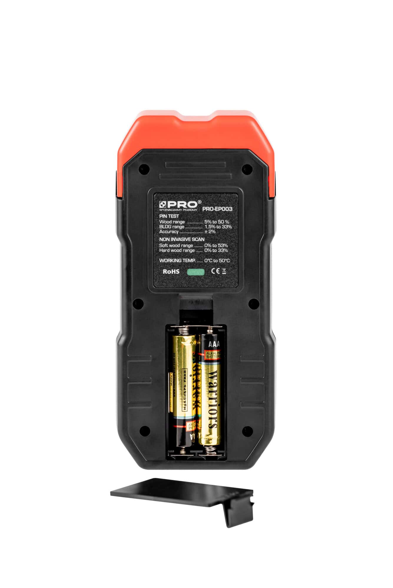 - Praca z próbnikiem szpilkowym: drewno: 5%-50%, materiały budowlane: 1,5%-33%, zakres błędu: +/-2%