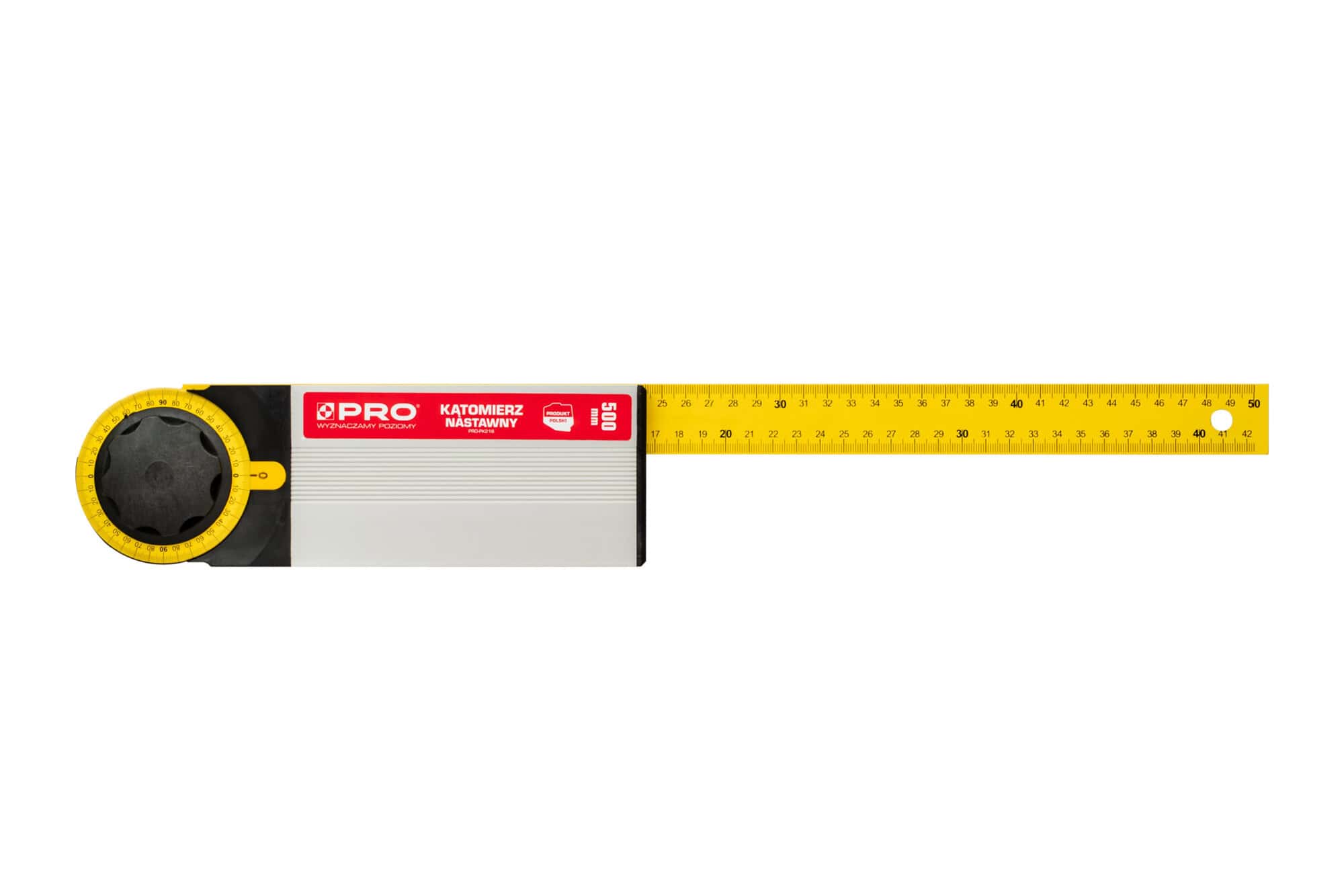 - Wyraźna i czytelna podziałka metryczna, umieszczona z dwóch stron ramienia. Dzięki temu możliwy jest pomiar od zewnętrznej i wewnętrznej krawędzi stopki kątomierza