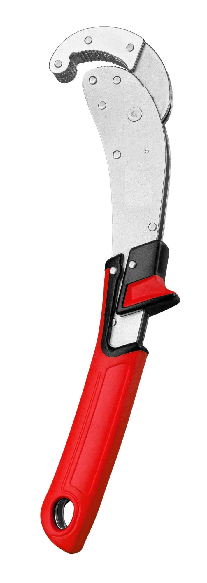 - Specjalna konstrukcja szczęk z zębami zakleszczającymi śrubę