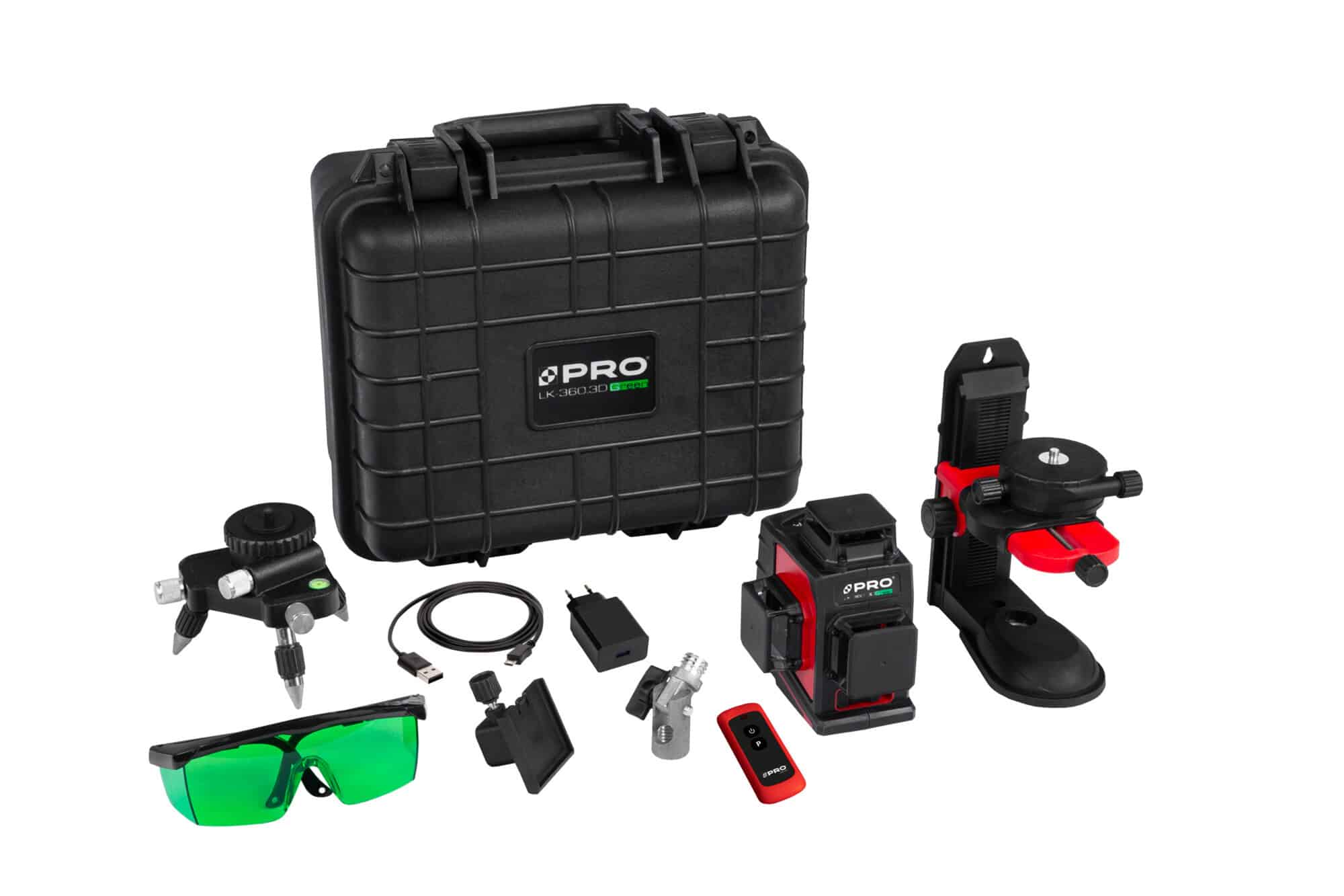 - Laser wieloliniowy LK-360.3DG generuje trzy płaszczyzny 360°, jedną poziomą oraz dwie płaszczyzny pionowe przecinające się pod kątem 90°.