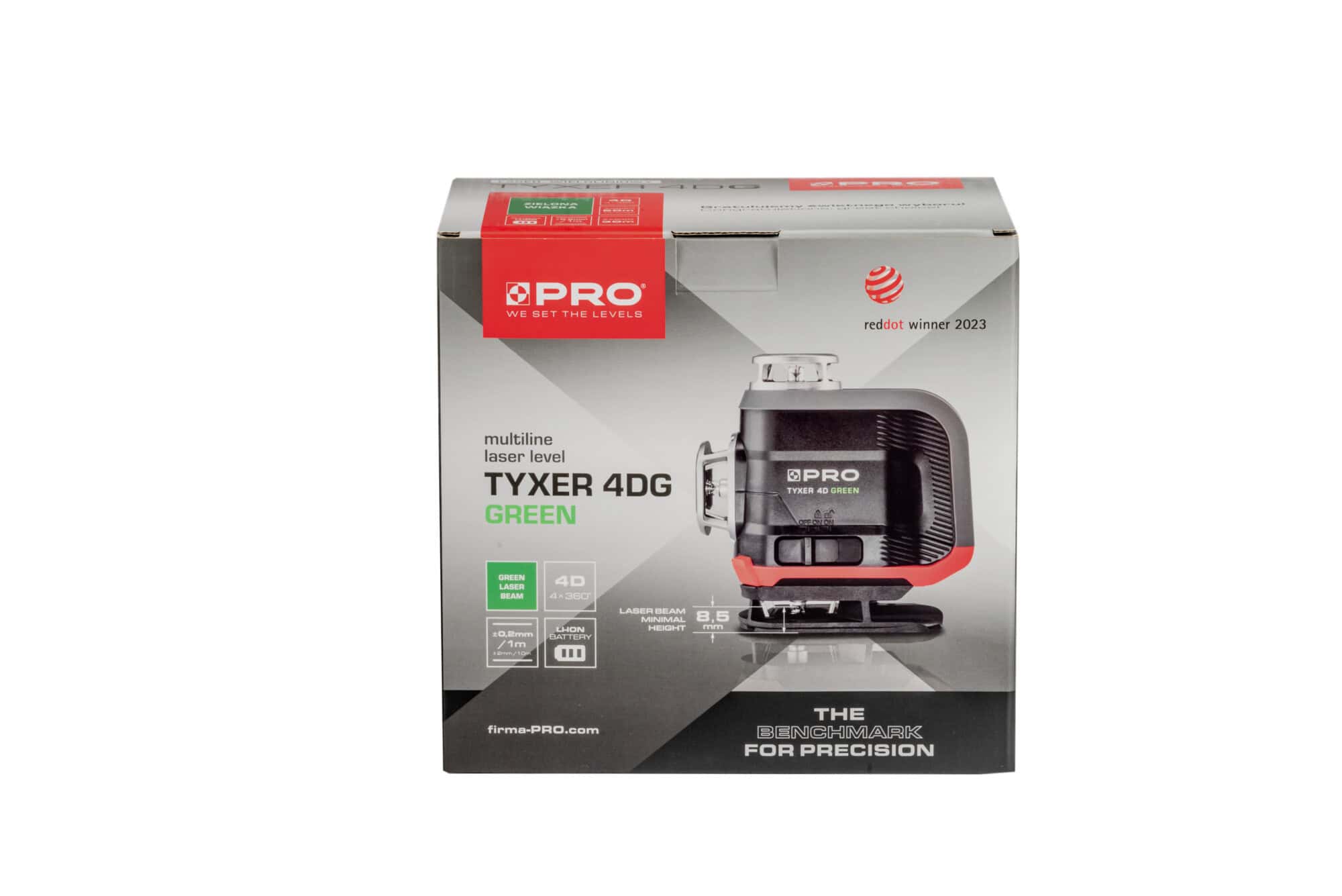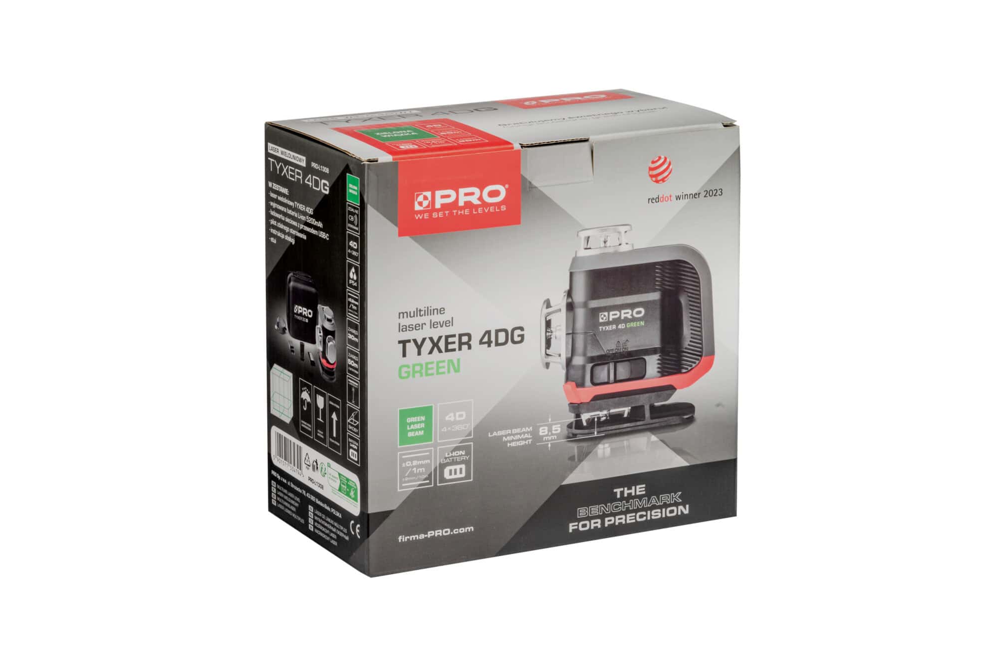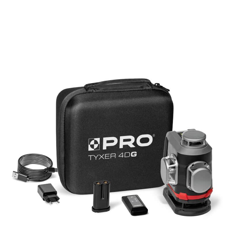 - Laser wieloliniowy TYXER 4DG generuje 4 płaszczyzny 360°, dwie poziome i dwie pionowe przecinające się pod kątem 90°