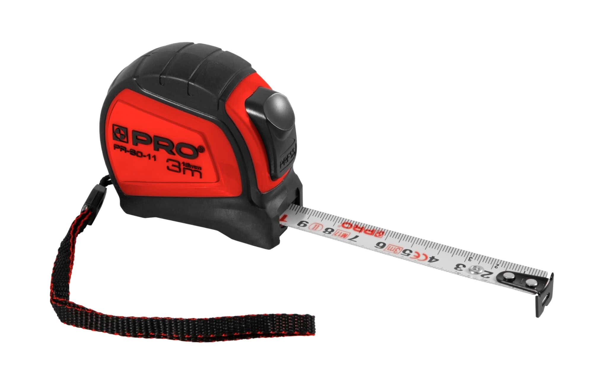 - Miara wyposażona w zderzak absorbujący uderzenie taśmy podczas zwijania