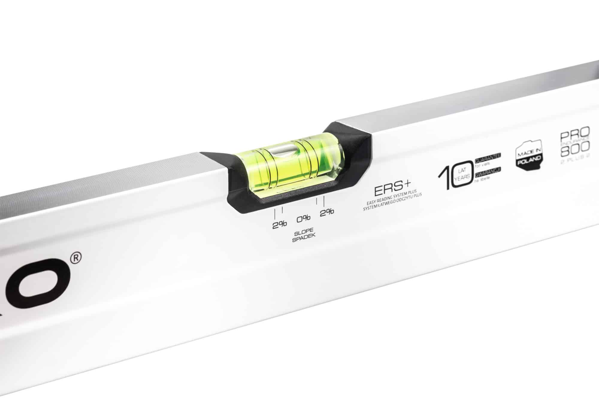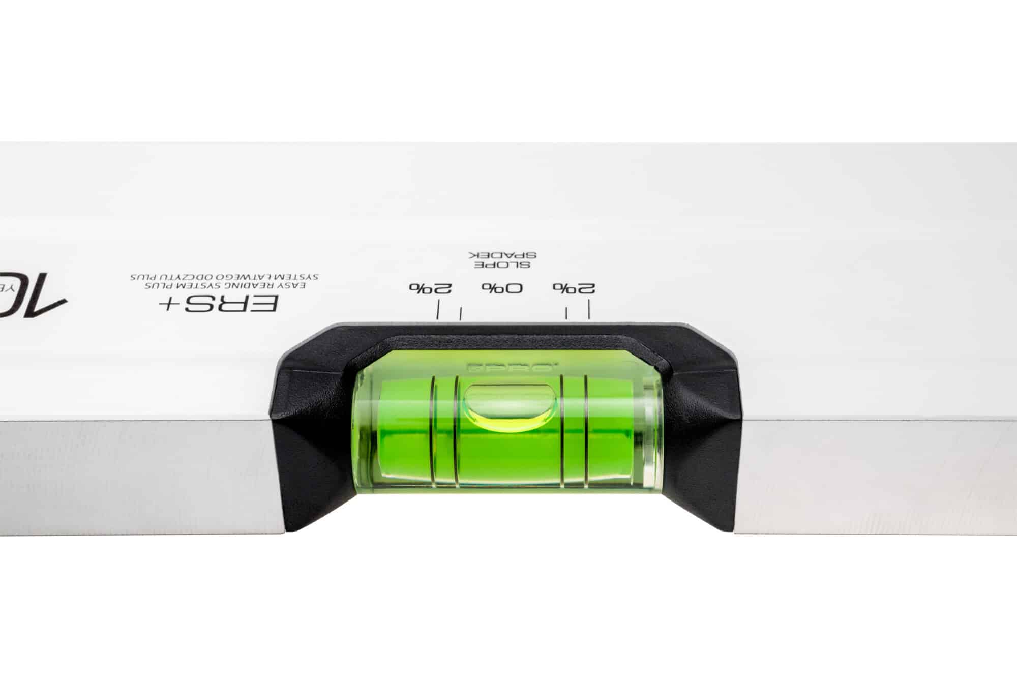 - Libella poziomu z dodatkowymi pierścieniami wyznaczającymi 2% spadek