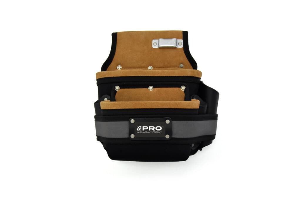 - Posiada 1 dużą i 1 średnią kieszeń na narzędzia oraz stalowy uchwyt na miarę zwijaną. Dodatkowo posiada 3 skórzane uchwyty na pojedyncze narzędzia np. wkrętaki, szczypce itp.