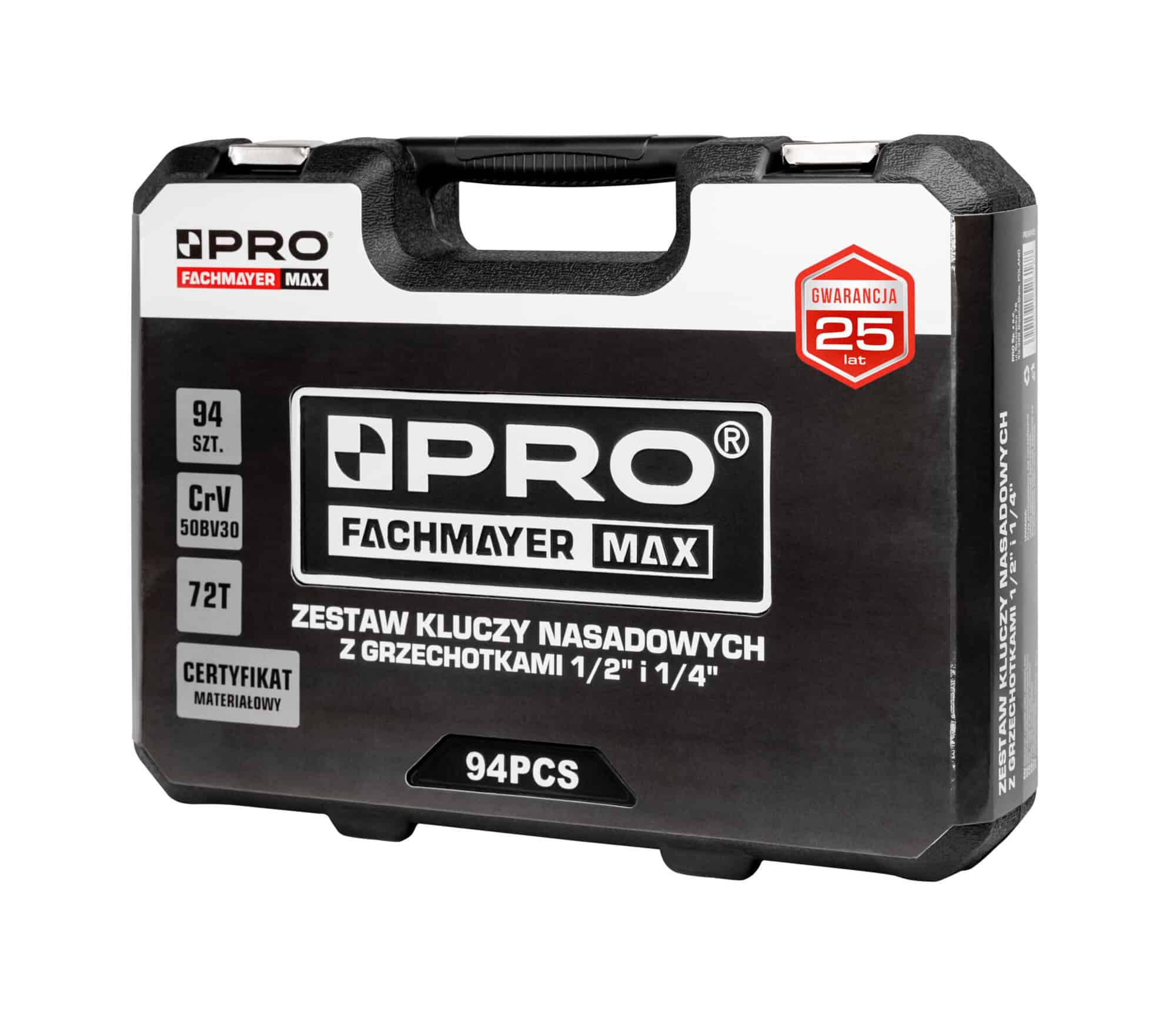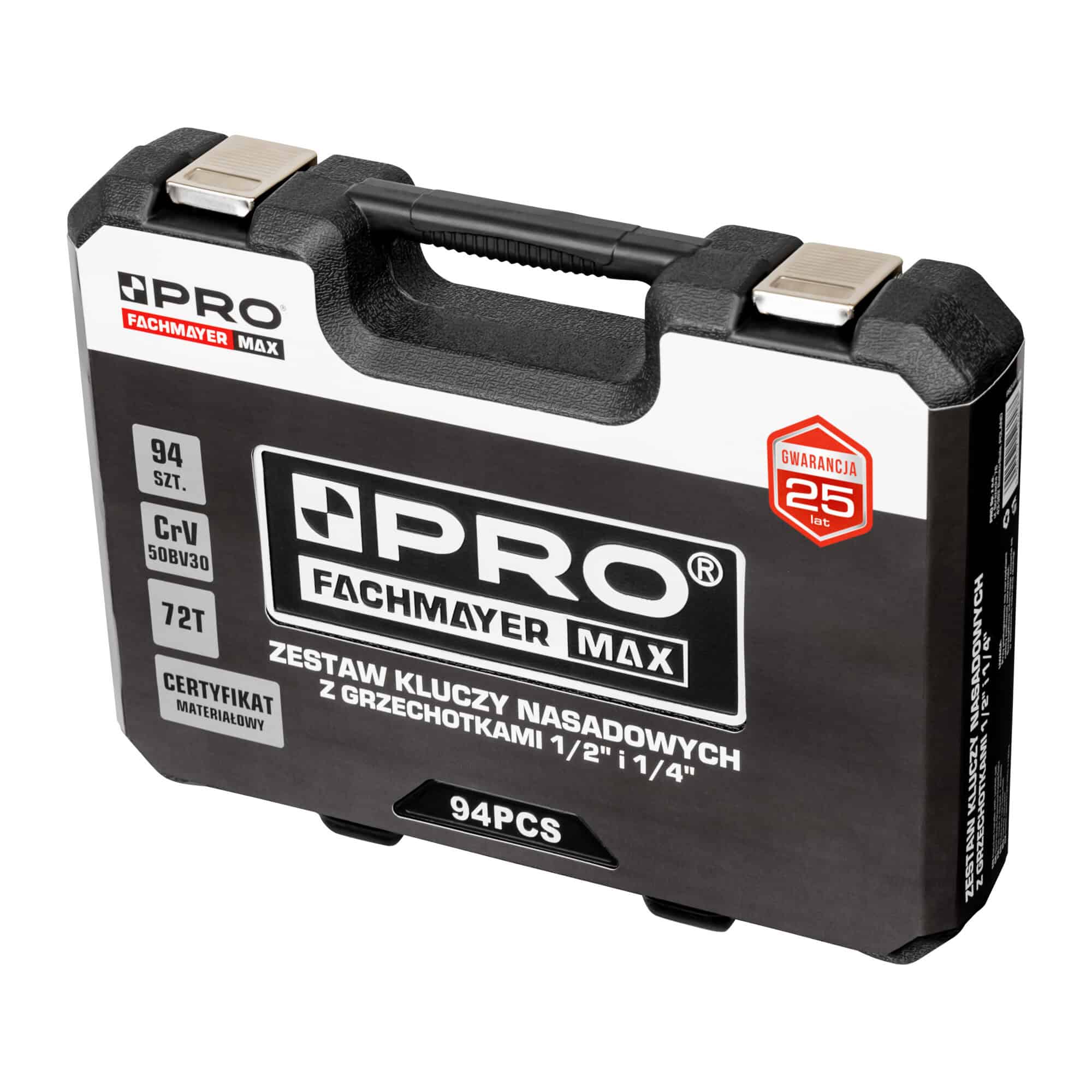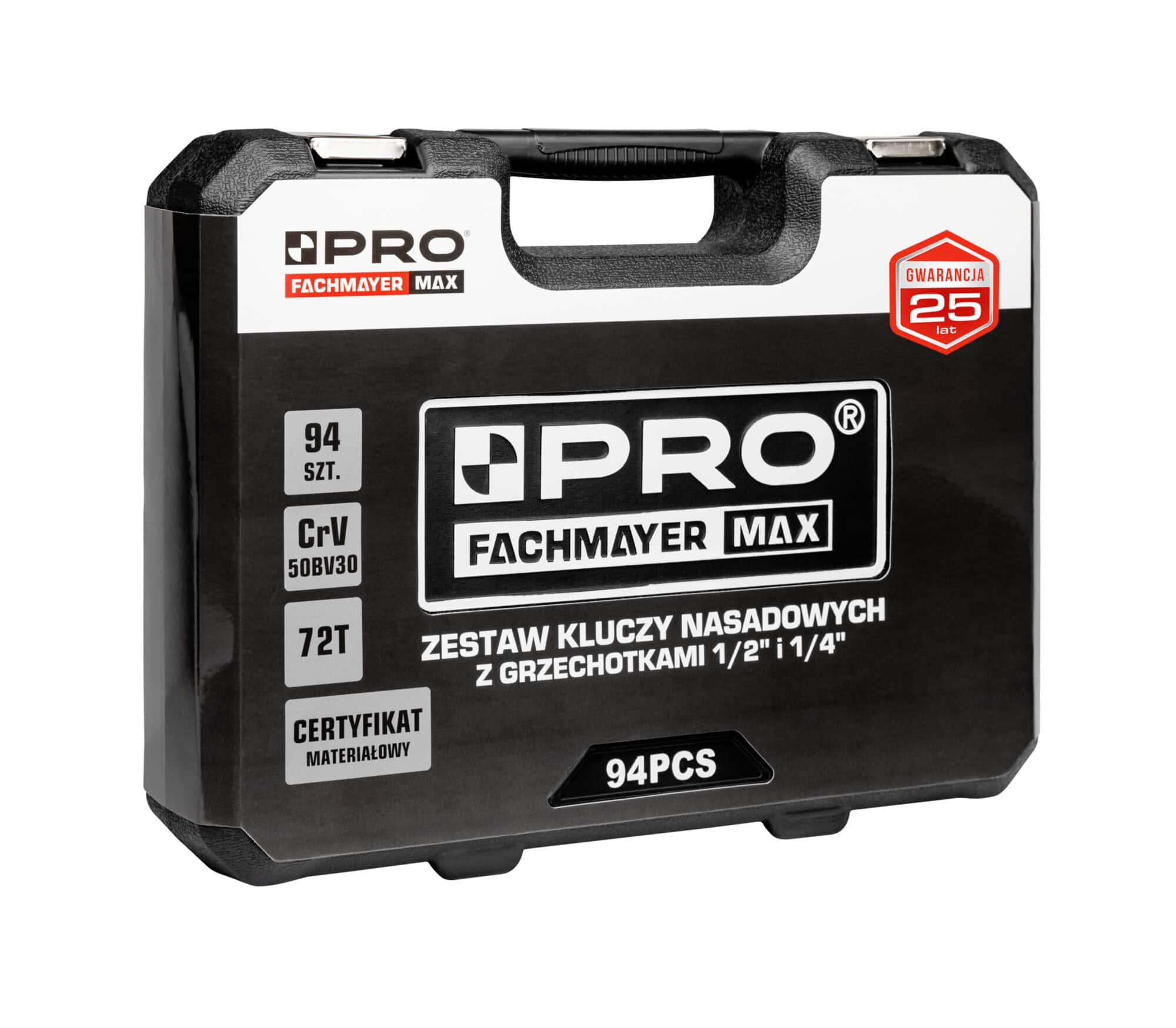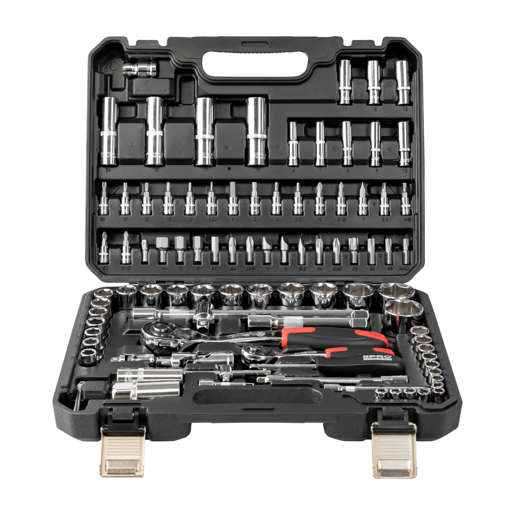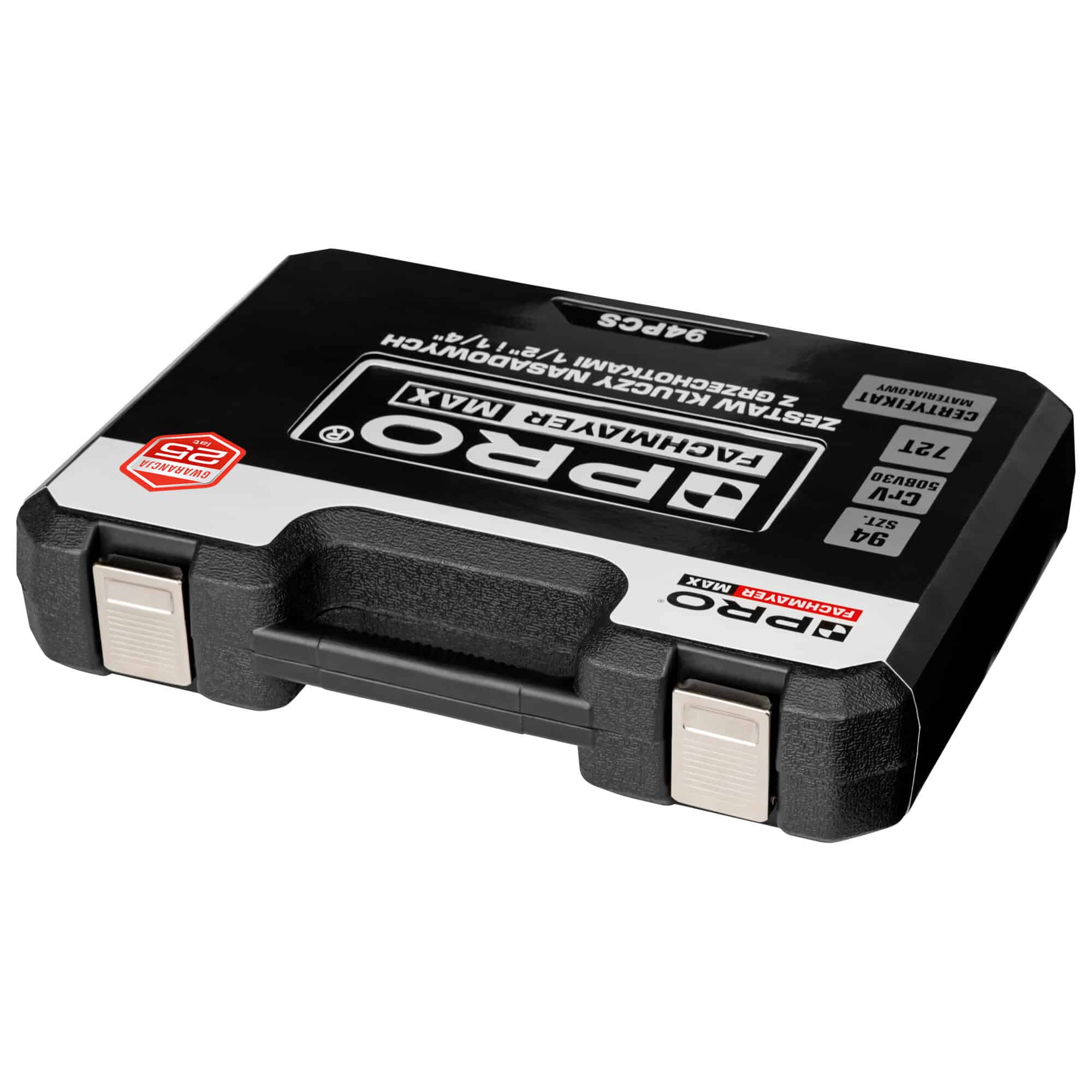 - kompletny zestaw kluczy nasadowych 1/2” i 1/4” składający się z 94 elementów: grzechotek, nasadek, końcówek wkrętakowych i innych akcesoriów oraz funkcjonalnej walizki