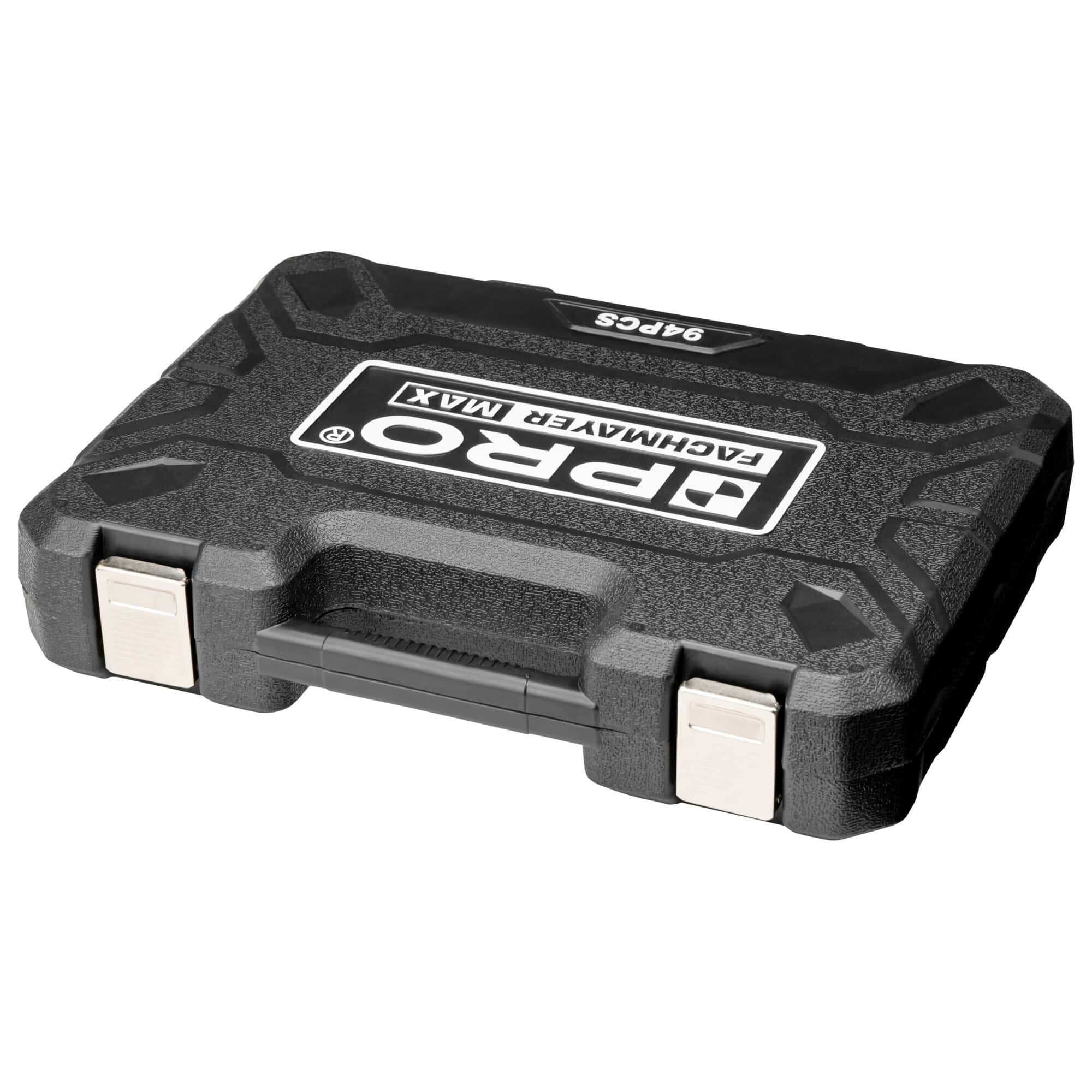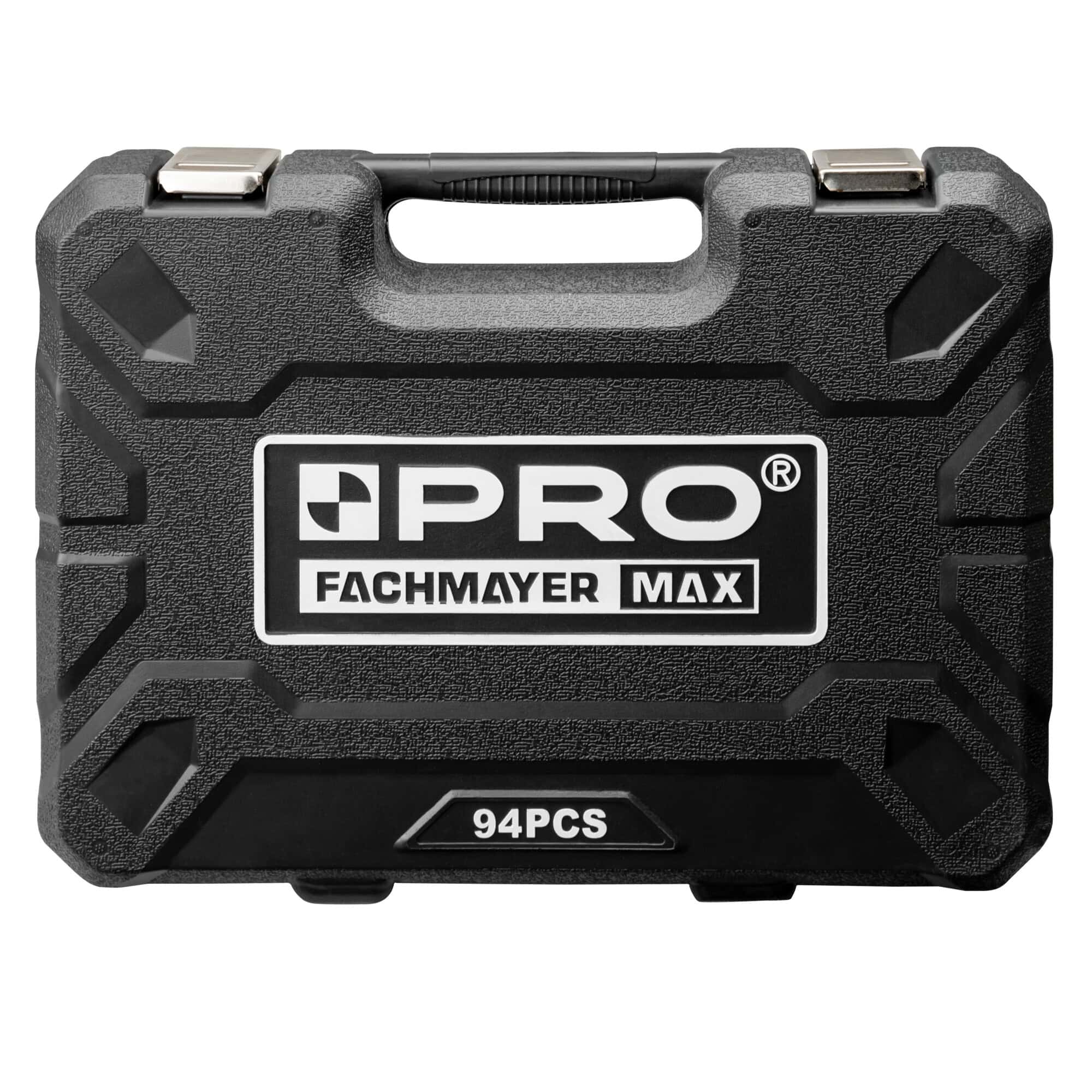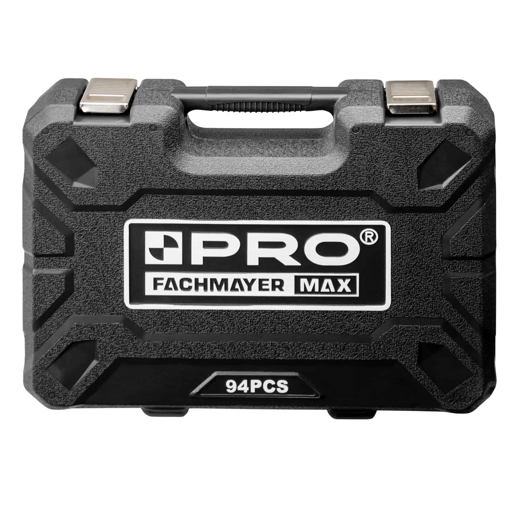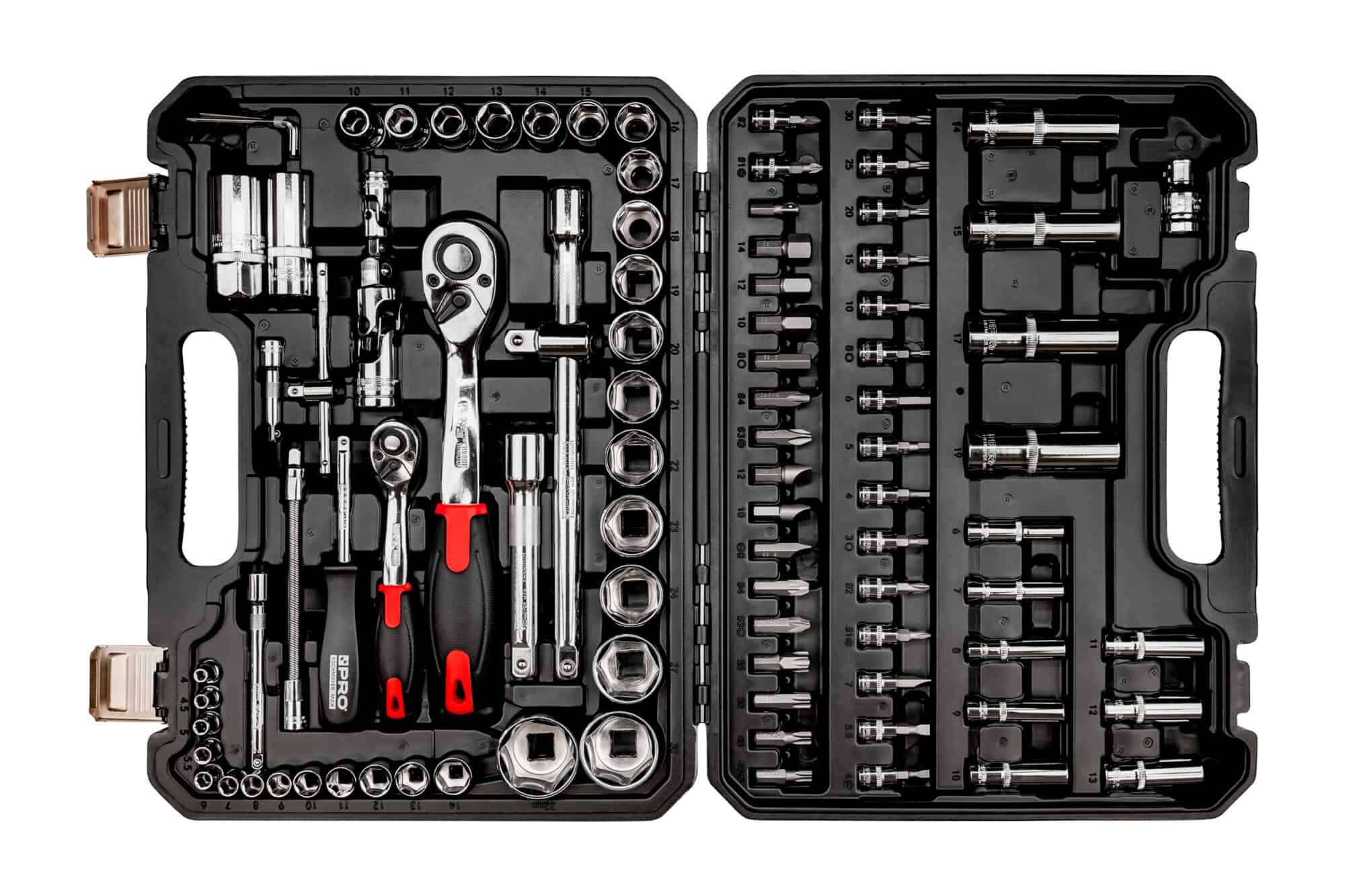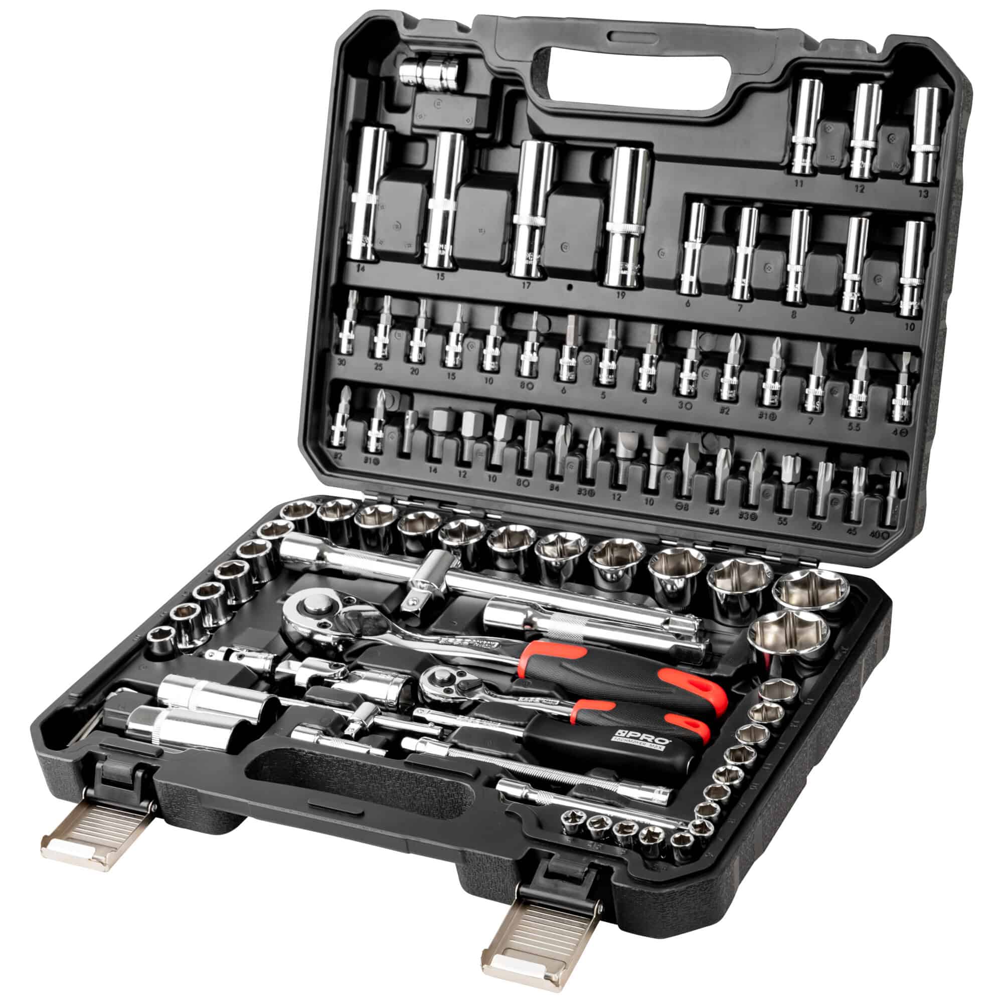 - kompletny zestaw kluczy nasadowych 1/2” i 1/4” składający się z 94 elementów: grzechotek, nasadek, końcówek wkrętakowych i innych akcesoriów oraz funkcjonalnej walizki