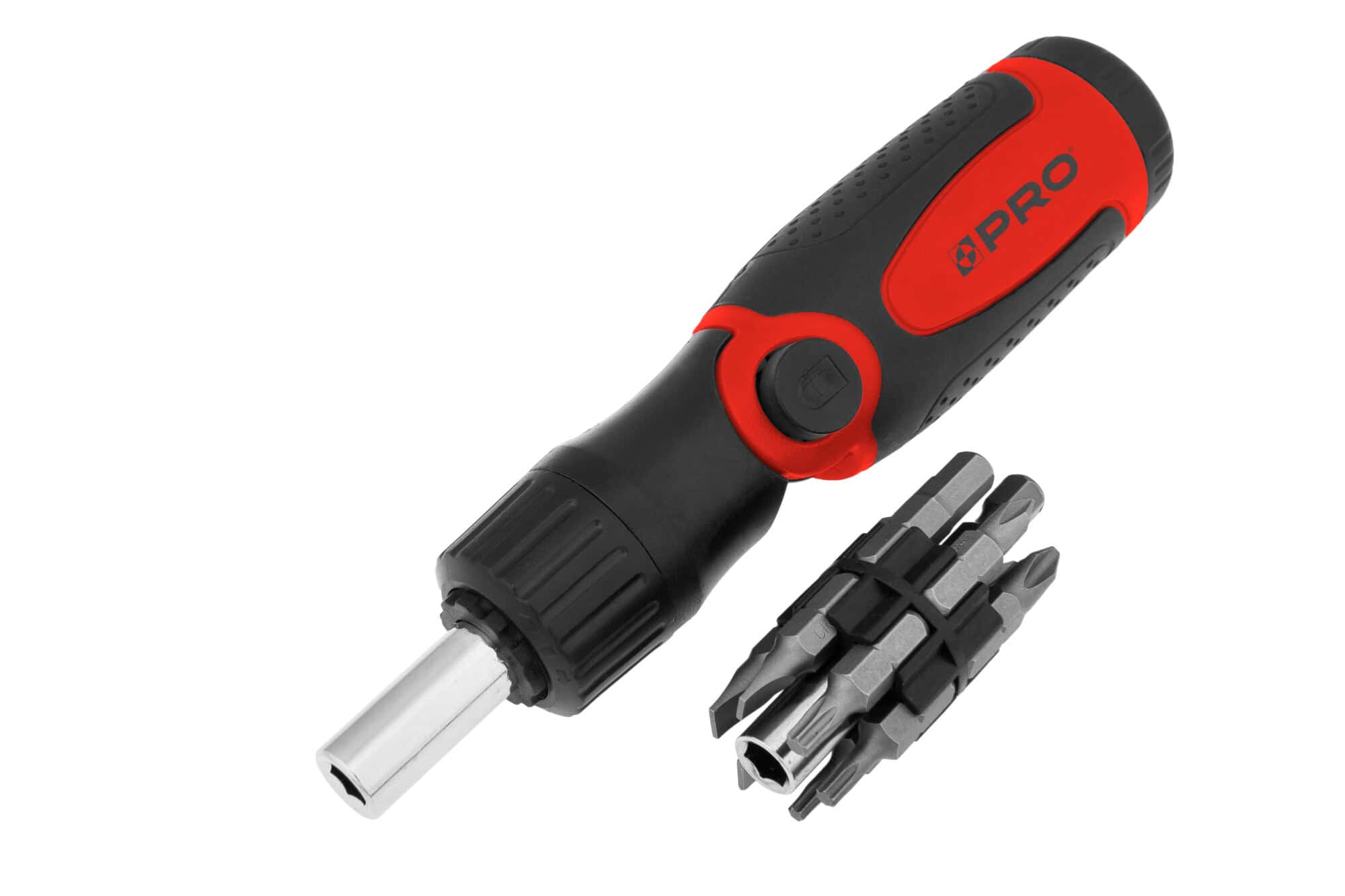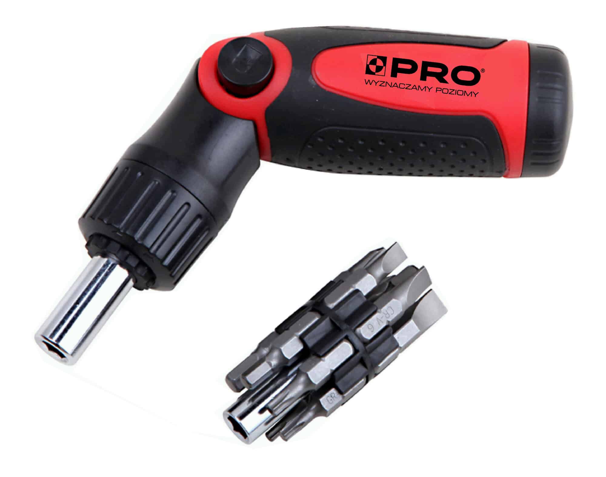 - W komplecie 12 bitów: SL 5, 6, 7 mm; PH1, PH2, PH3; TORX T10, T15, T20; HEX H4, H5, H6 oraz uchwyt magnetyczny 60 mm