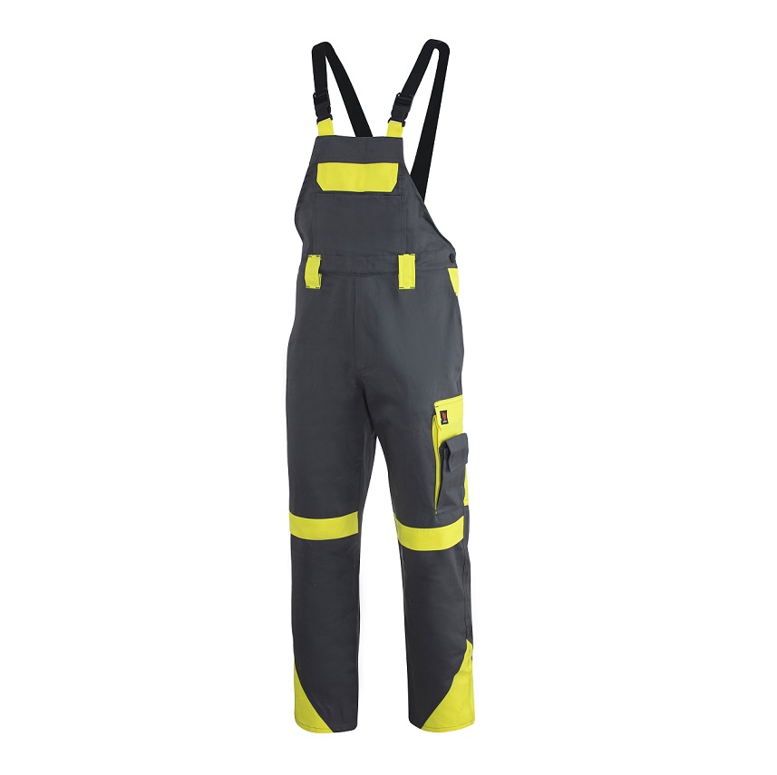 Spodnie ogrodniczki Proplus – tkanina zasadnicza: 100% bawe³na o gramaturze 250 g/m2, wstawki z materia³u kontrastowego: 65% poliester, 35% bawe³na o gramaturze 250 g/m2. 10 funkcjonalnych kieszeni w tym kieszeñ tylna, 2 kieszenie przednie (jedna podwójna) 4 kieszenie boczne w tym kieszeñ na telefon i calówkê oraz kieszeñ typu bojówka oraz 2 kieszenie na bawecie, jedna z przegródkami np. na o³ówek.Dodatkowa regulacja obwodu pasa. Rygle wzmacniaj¹ce i podwójne szwy zwiêkszaj¹ce wytrzyma³oœæ. Wysokiej jakoœci guma szelkowa i klamry. Rozmiary od 48-62.
