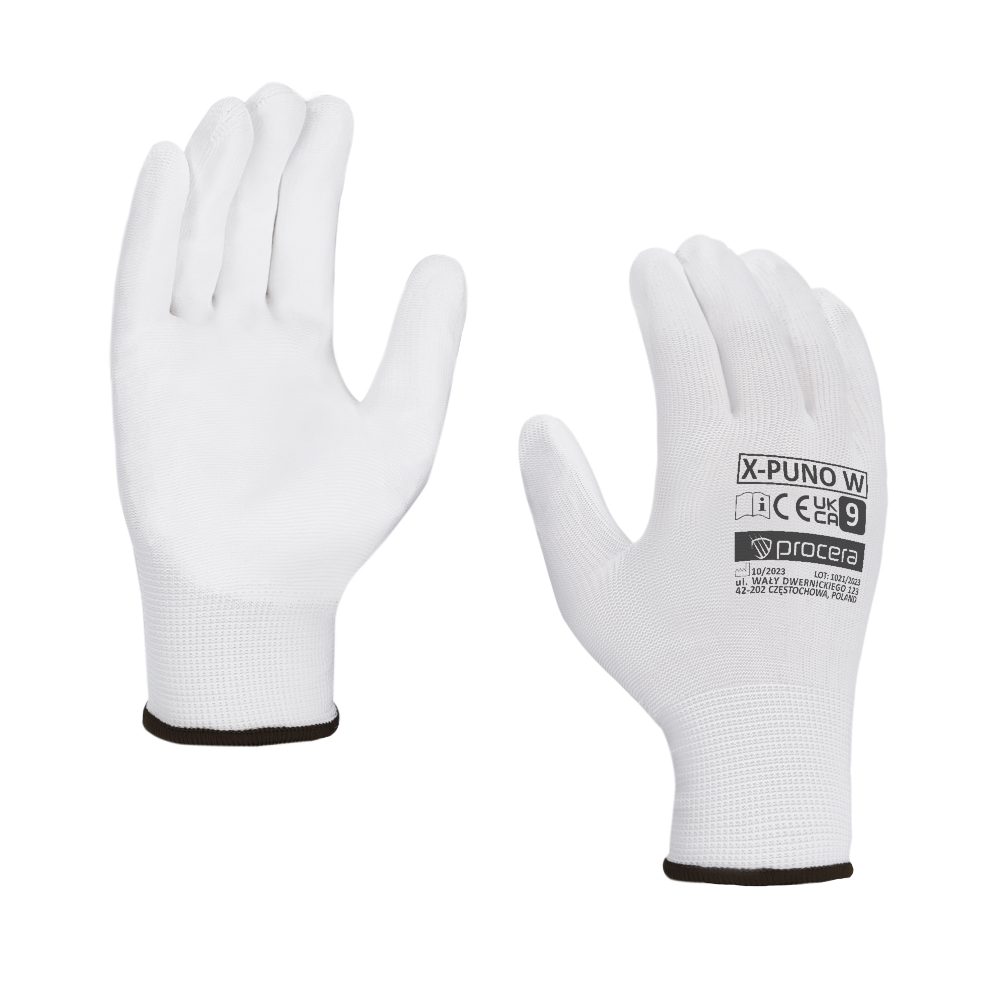 Rękawice X-PUNO WHITE wykonane z poliestru, powlekane w części chwytnej poliuretanem. Idealne do prac manualnych. Bardzo dobre czucie trzymanego przedmiotu. Dobrze dopasowują się do kształtu dłoni. Rozciągliwe i elastyczne. Zakończone ściągaczem. Kategoria I. Opakowanie: karton 12/240. Kolor: biały/biały. Dostępne w rozmiarach: 6, 7, 8, 9, 10, 11..