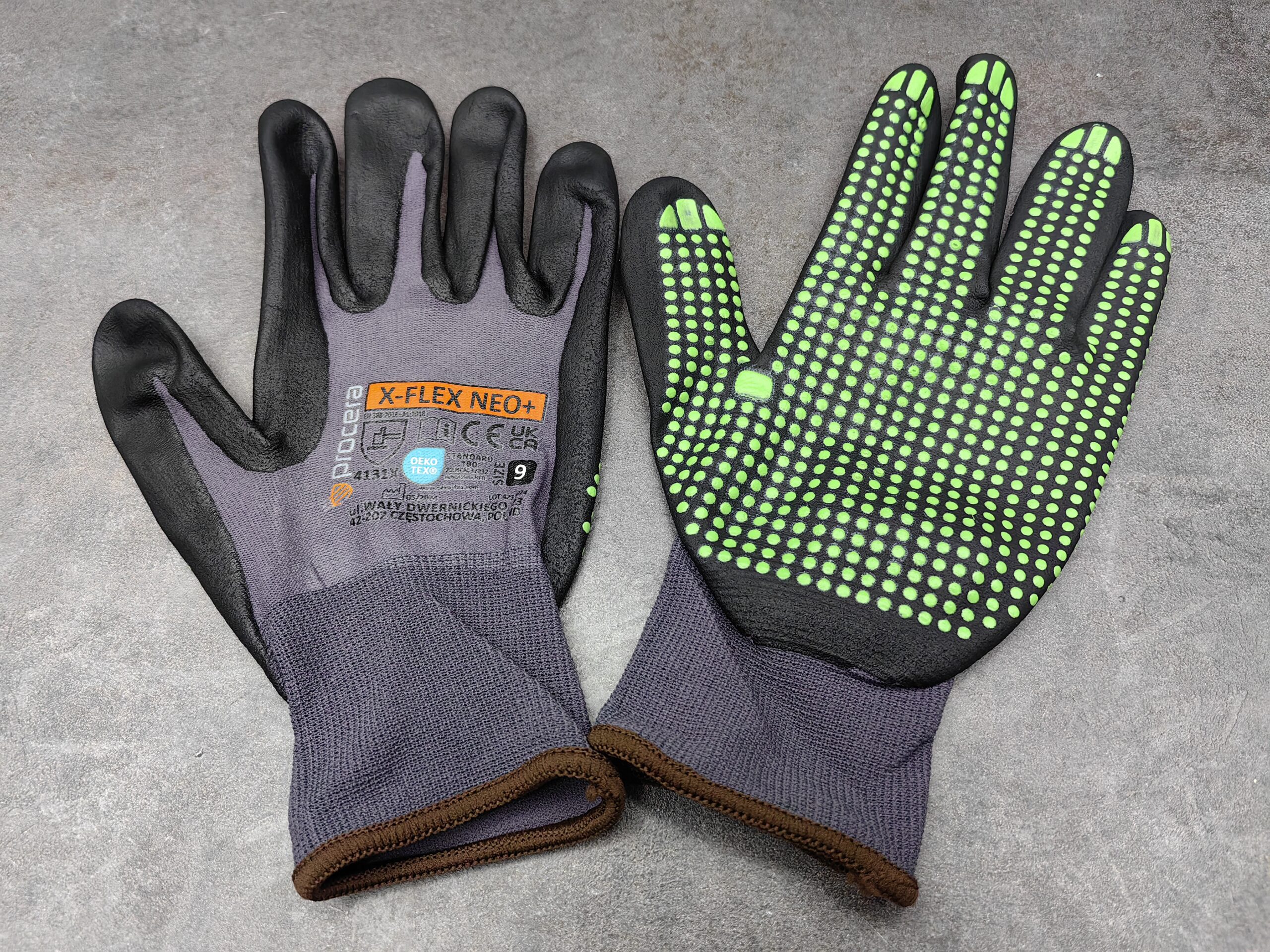 Rękawice X-FLEX NEO PLUS wykonane z dzianiny nylonowo poliestrowej z dodatkiem lycry, powlekane w części chwytnej spienionym nitrylem w kolorze czarnym oraz dodatkowym nakropieniem w kolorze zielonym. Idealne do prac manualnych. Podwyższona odporność na oleje oraz smary. Dobrze dopasowują się do kształtu dłoni. Rozciągliwe i elastyczne. Zakończone ściągaczem. Dostępne rozmiary 7-11. Opakowanie 240 par . CE EN 388:2016+A1:2018.