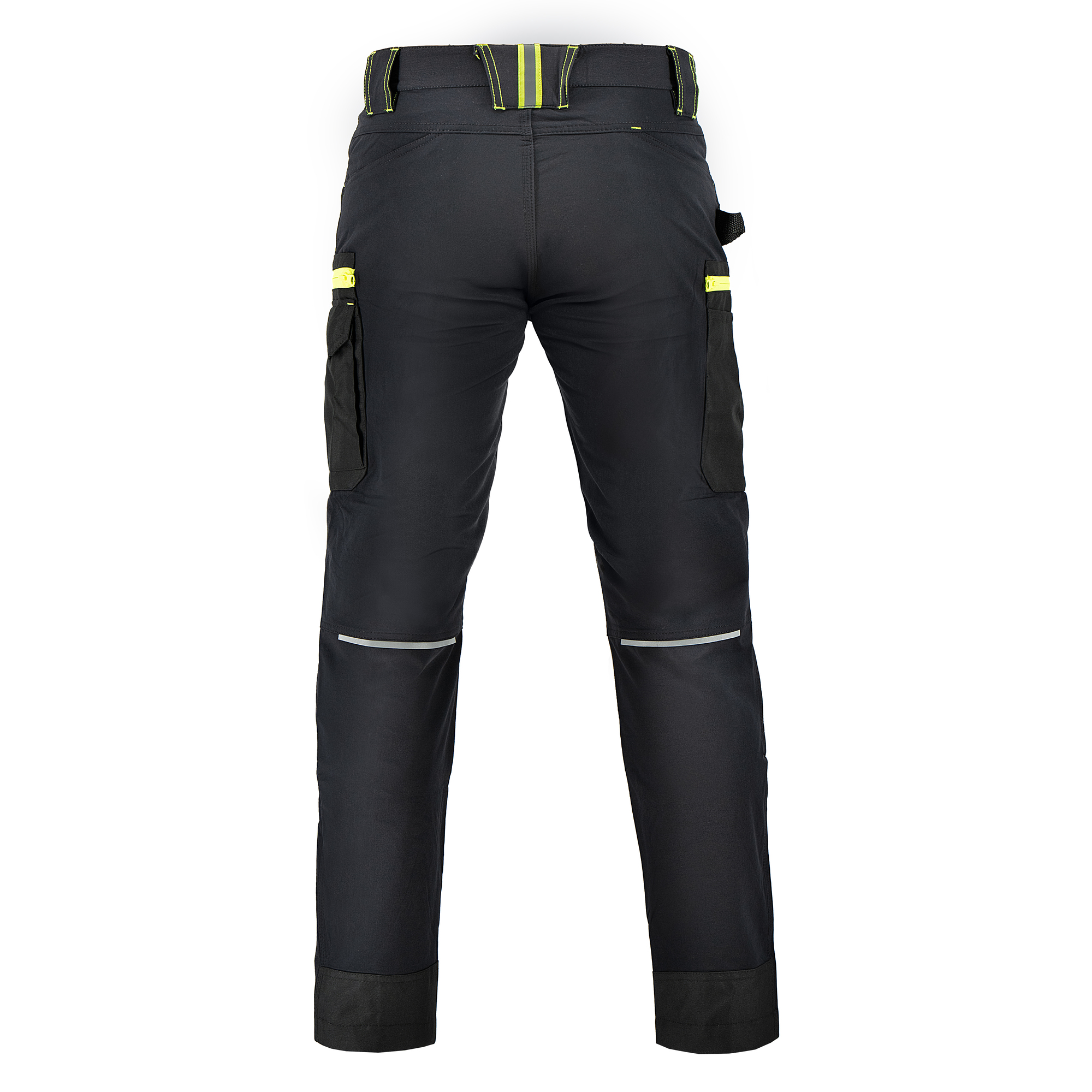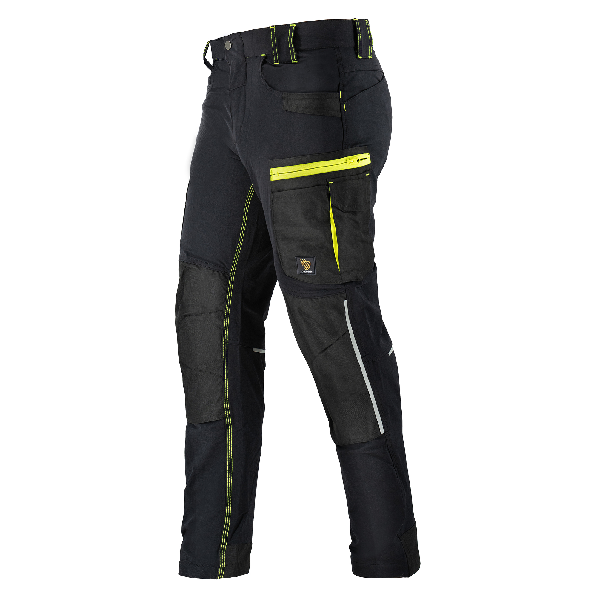 Spodnie wykonane z wysokiej jakości, znanej z odzieży outdoorowej elastycznej tkaniny typu “4-way stretch” o składzie: 90% NYLON, 10% SPANDEX o gramaturze 240 g/m^2. Posiadają wiele funkcjonalnych kieszeni, w tym dwie kieszenie przednie, dwie podwójne kieszenie na udach oraz dwie kieszenie tylne zapinane na rzepy. Ich niezwykle praktyczny krój i elastyczny materiał rozciągający się we wszystkich kierunkach zapewniają maksymalną swobodę ruchów. Wzmocnienia z materiału zabezpieczającego przed przetarciem na nogawkach, kieszeniach i kolanach z możliwością zastosowania wkładek nakolannikowych. Rygle wzmacniające i potrójne szwy zwiększające wytrzymałość. Przyjemne w dotyku wykończenie wewnętrzne. Sprawdzą się zarówno w pracy, jak i podczas zajęć rekreacyjnych. Nowoczesna kolorystyka i design. Elementy odblaskowe w szwach bocznych i z tyłu. Kolor: czarny. Dostępne w rozmiarach 46-60