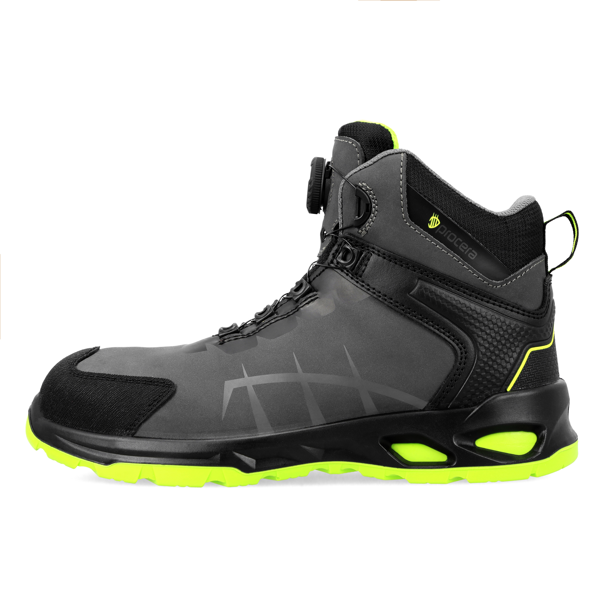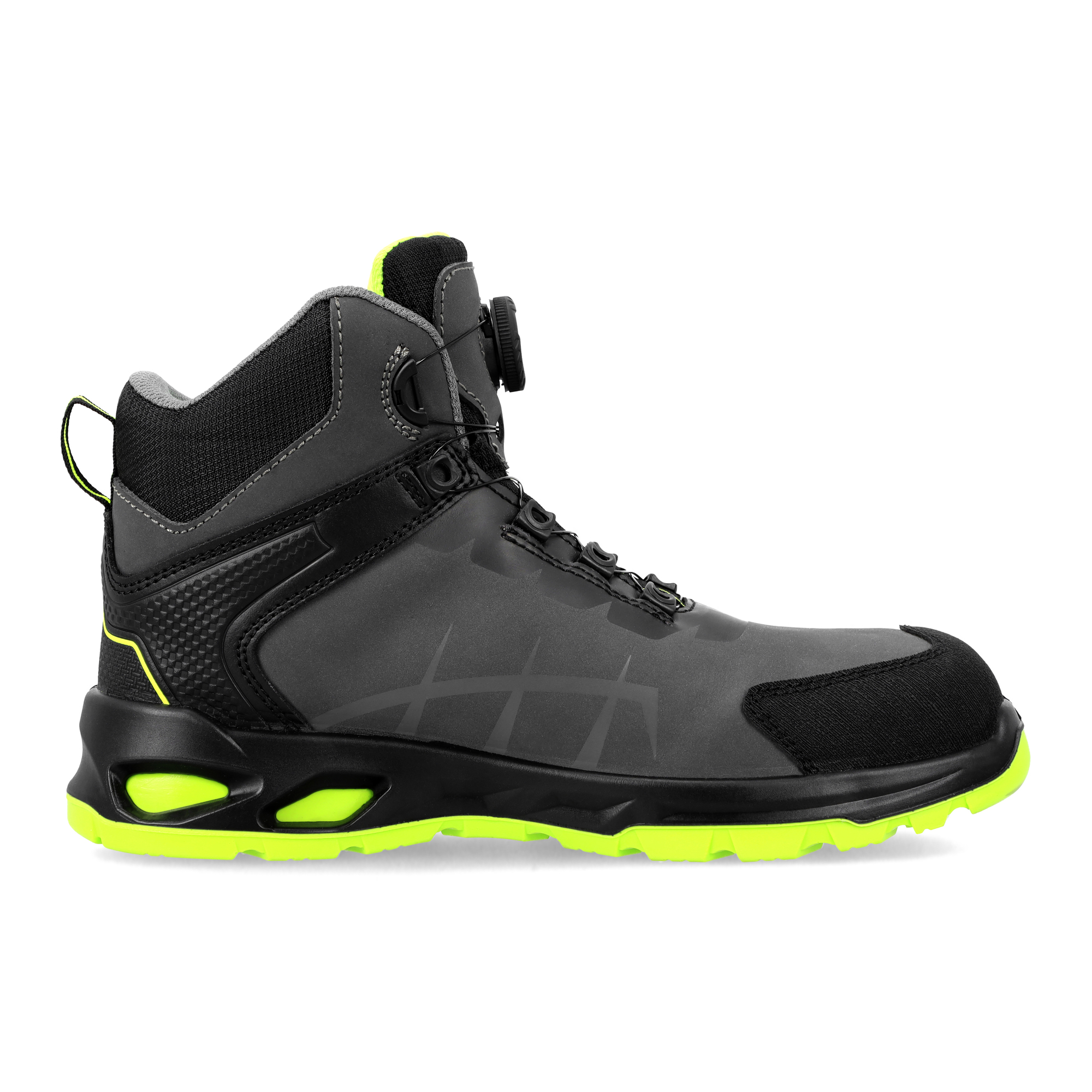 Trzewiki bezpieczne NEXO HIGH S3S z systemem sznurowania SPINPRO. Wykonane ze skóry nubukowej, ze stalowym podnoskiem ochronnym oraz kevlarową wkładką antyprzebiciową. Podeszwa z dwugęstościowego poliuretanu PU/PU, antyelektrostatyczna, antypoślizgowa i olejoodporna. Absorpcja energii w części piętowej. Komfortowa, miękka, elastyczna wkładka z pianki z włókien organicznych o wysokich właściwościach absorbcji wstrząsów, oddychających i przeciwpotnych. Wyściółka z materiału o właściwościach higroskopijnych i wentylujących. Wysoka cholewka zapewnia dodatkową stabilizację i ochronę kostki. Wzmocnienie czubków zapobiega przetarciom i uszkodzeniom mechanicznym. Kategoria S3S SR. Spełnia wymagania normy EN ISO 20345:2022.