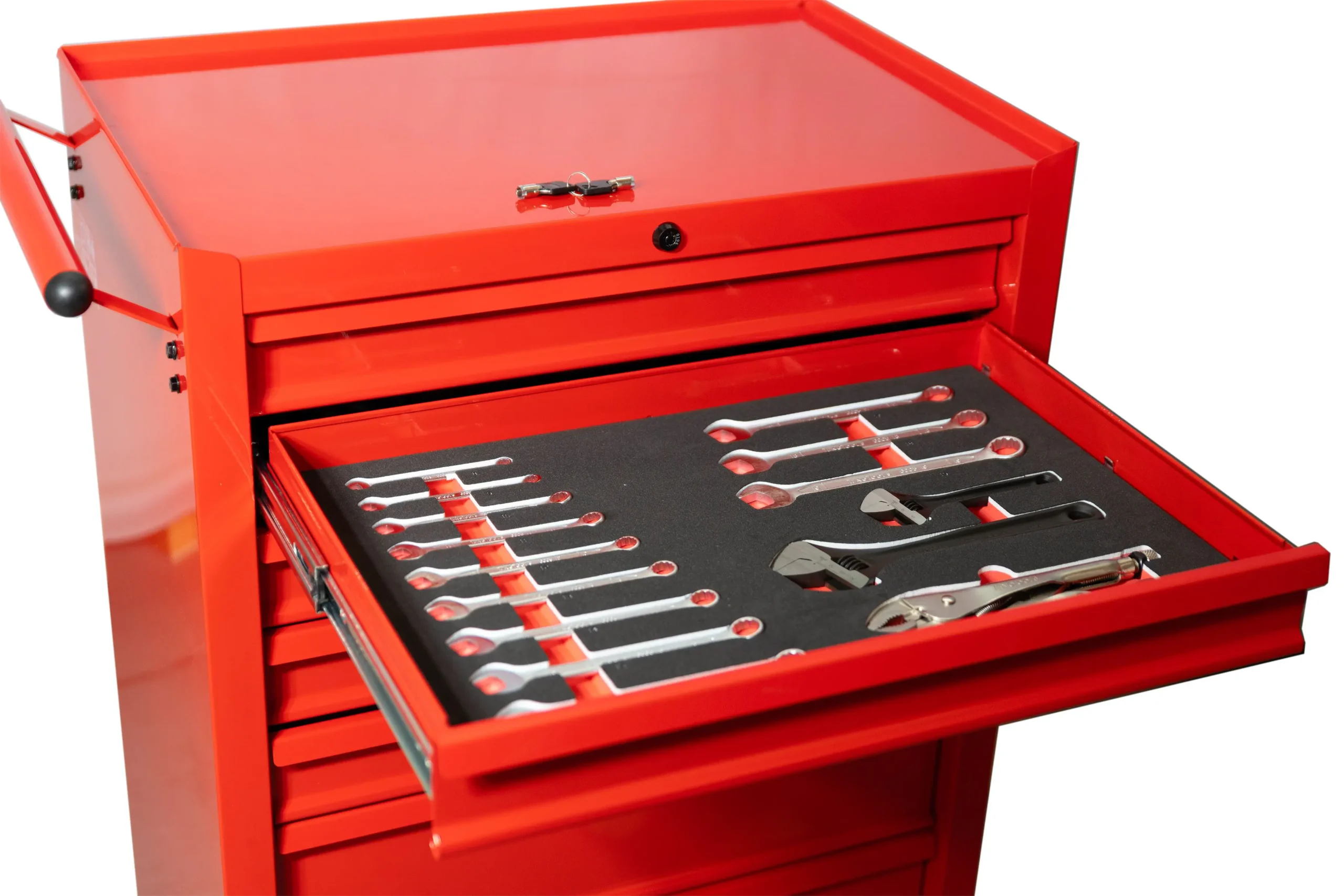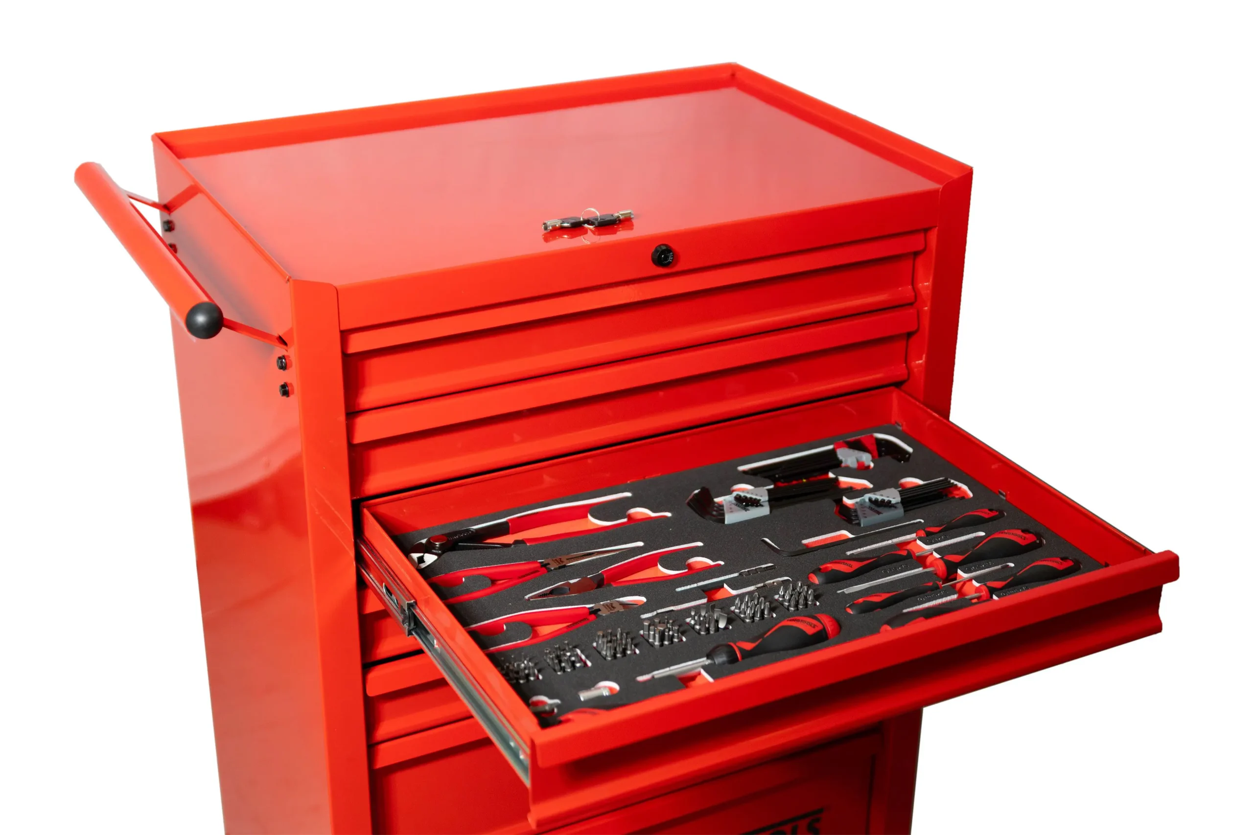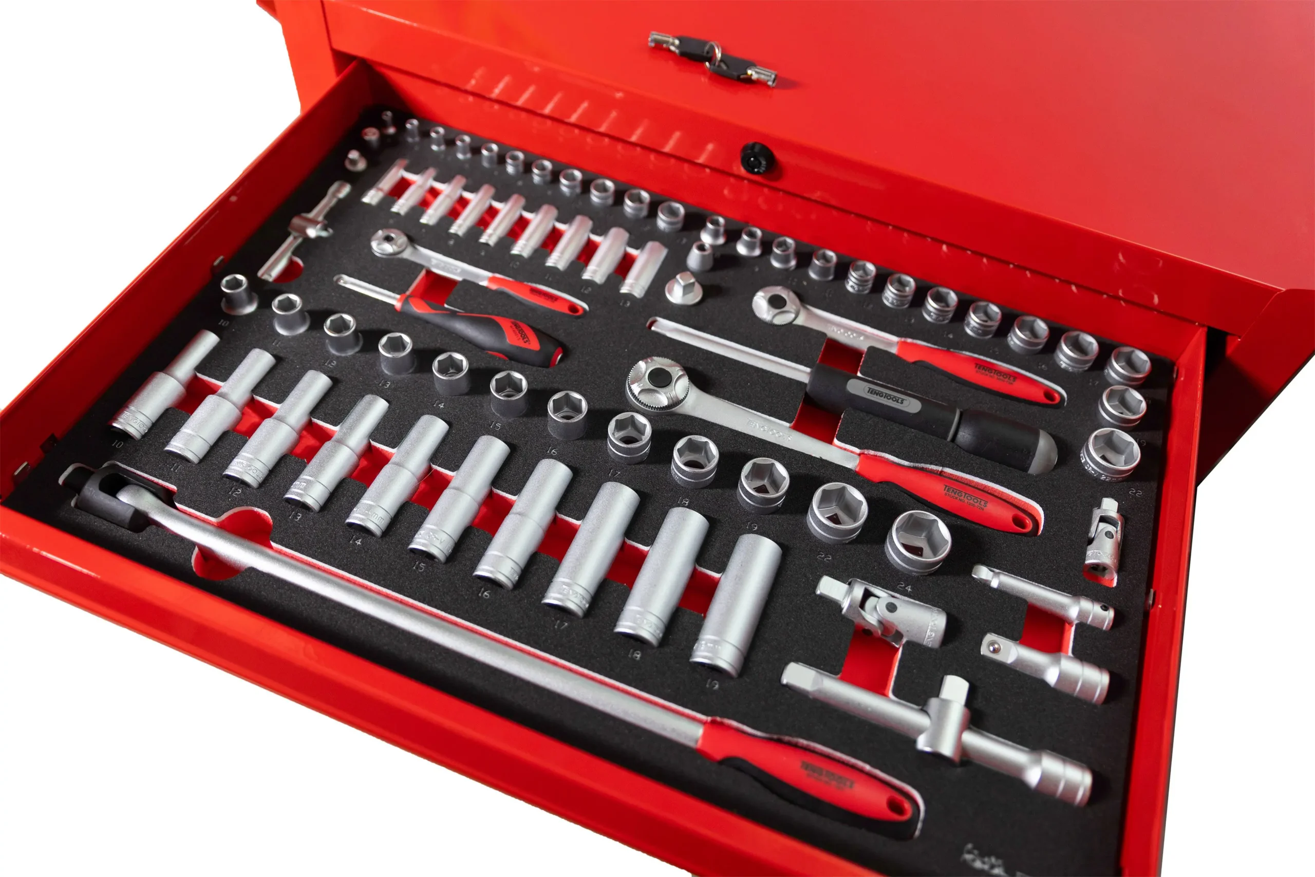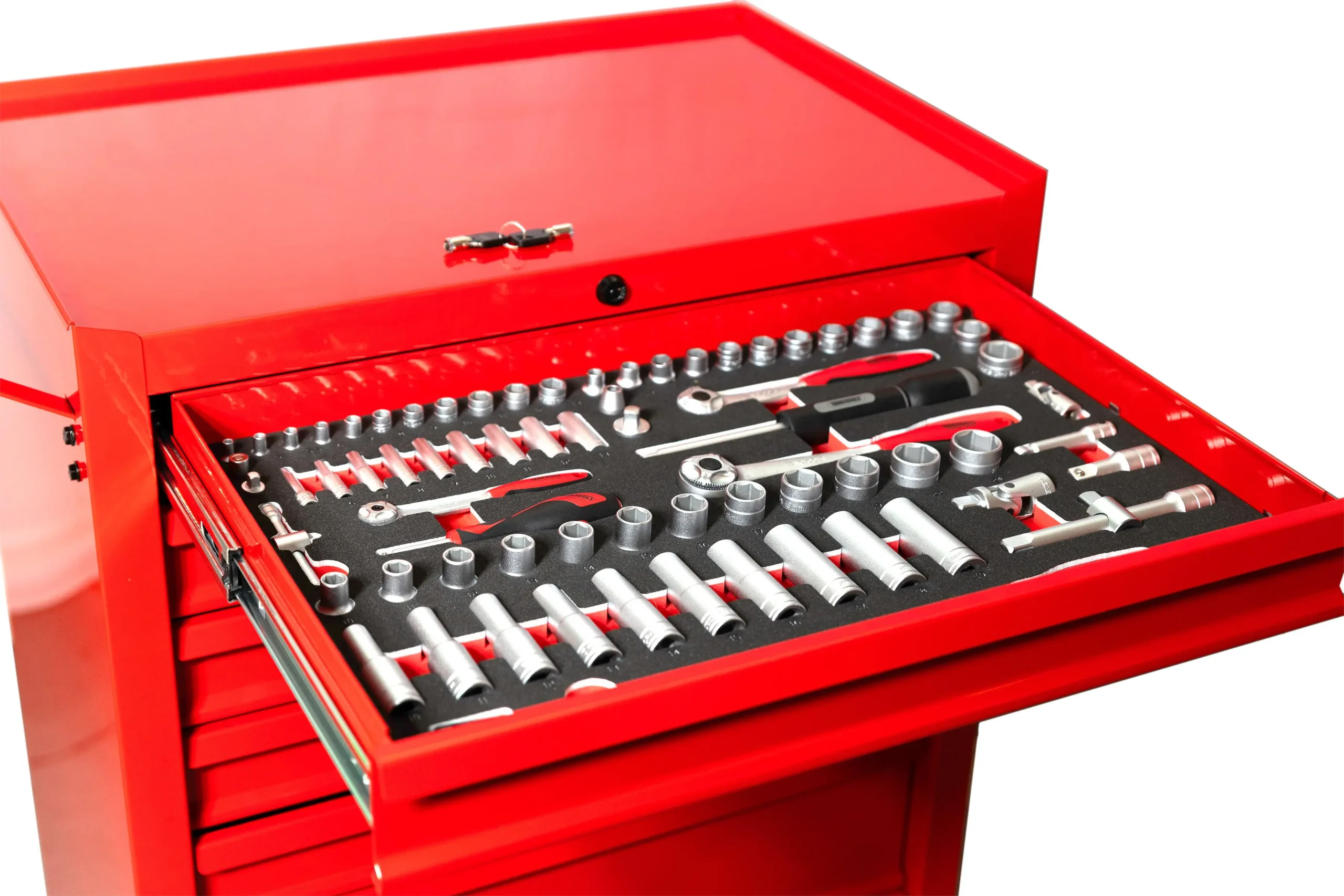 TengTools TCMME217KA to kompleksowy, 217-elementowy zestaw narzędzi zintegrowany z 27-calową, klasyczną, czerwoną szafką narzędziową, zaprojektowany z myślą o profesjonalnych zastosowaniach. Narzędzia są uporządkowane w precyzyjnie wyciętych, trójkolorowych wkładkach z pianki EVA o wysokiej gęstości w czterech z siedmiu szuflad szafki, pozostawiając dodatkową przestrzeń do przyszłej rozbudowy i personalizacji. Są one kompatybilne z systemem kontroli narzędzi TengTools, który umożliwia szybką identyfikację brakujących narzędzi, zwiększając wydajność i bezpieczeństwo. Zestaw narzędzi TCMME217KA oferuje szeroki wybór nasadek z kwadratowymi chwytami 1/4?, 3/8? i 1/2?, z niezawodnymi grzechotkami 72-zębowymi oraz standardowymi i głębokimi nasadkami metrycznymi w zakresie od 4 mm do 24 mm. Akcesoria, takie jak przedłużki, przeguby krzyżakowe i adaptery napędowe, zwiększają wszechstronność, a klucze płasko-oczkowe, dwa klucze nastawne i szczypce z zakrzywionymi szczękami umożliwiają wykonywanie różnorodnych zadań związanych z mocowaniem. Narzędzia ogólnego przeznaczenia obejmują młotki, przyrządy pomiarowe, dłuta, przebijaki, nóż uniwersalny i piłę do metalu, uzupełnione szczypcami do chwytania i cięcia drutu. Pełen asortyment wkrętaków uzupełniono o wkrętak z grzechotką 1/4? oraz bogaty wybór bitów zapewniających kompatybilność z wieloma śrubami. Dodatkowo zestaw zawiera klucze imbusowe z końcówką kulkową w rozmiarach metrycznych i AF, a także klucze TX. Wykonana z grubej stali z czerwonym wykończeniem proszkowym, szafka gwarantuje trwałość i odporność na korozję. Siedem szuflad o udźwigu 30 kg każda, w pełni wysuwanych dla łatwego dostępu i obsługiwanych przez trzystopniowe prowadnice kulkowe, jest wyposażona w trzystopniowe prowadnice kulkowe. Pięć szuflad ma 76 mm wysokości, a dwie głębsze zapewniają 151 mm miejsca na przechowywanie większych narzędzi. Mobilność szafki na kółkach zapewniają wstępnie zmontowane, wytrzymałe kółka 5? × 2?, dwa stałe i dwa obrotowe z hamulcem, a także solidny metalowy uchwyt boczny. Zintegrowany zamek na klucz zabezpiecza wszystkie szuflady, chroniąc narzędzia podczas transportu lub przechowywania.