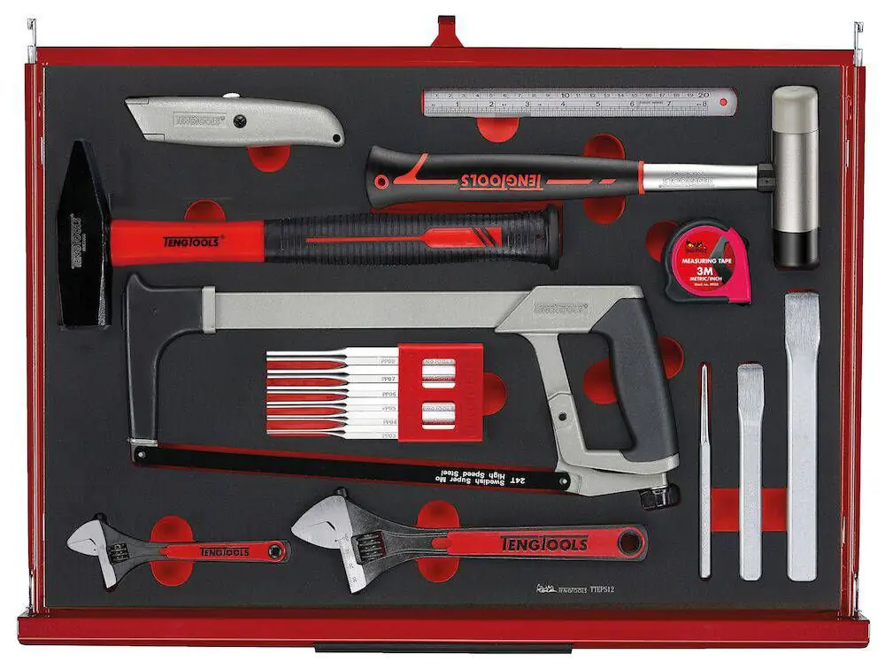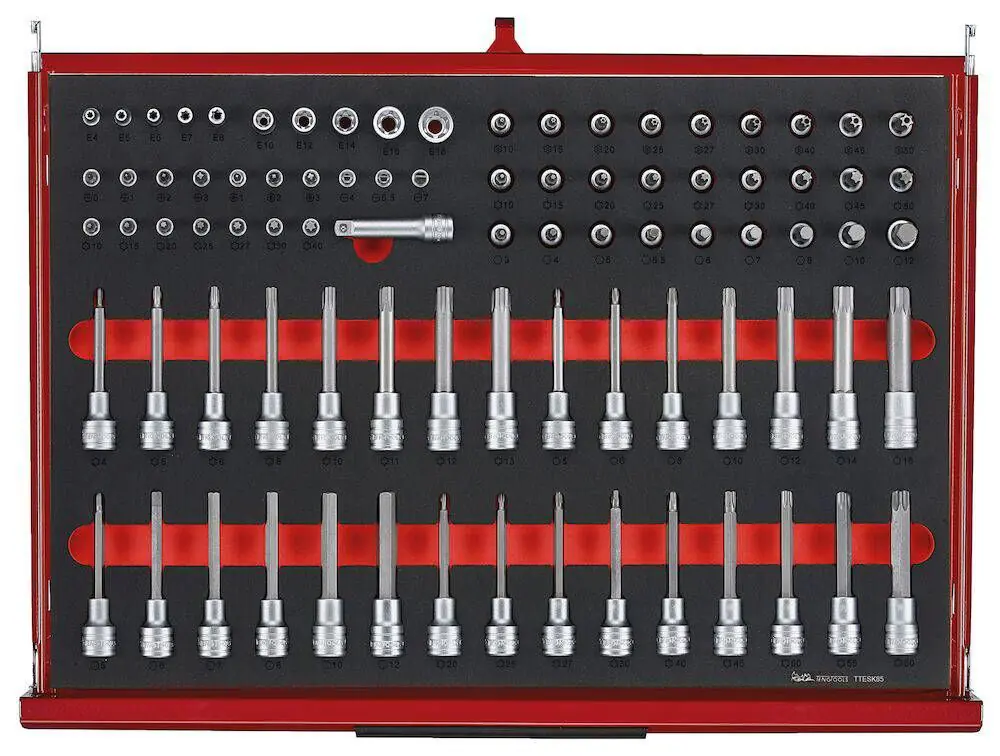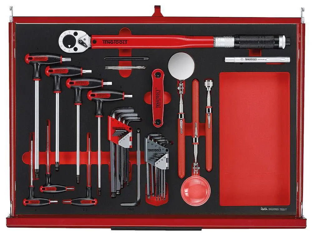 Zestaw narzędzi TengTools 26″ PRO35™ TKW26R335F w matowym czerwonym wykończeniu zawiera 335 elementów umieszczonych w wytrzymałej szafce na kółkach TSW26R7 o szerokości 680 mm, głębokości 460 mm i wysokości 960 mm z zamontowanymi kółkami. Praktyczna szafka na kółkach ma siedem w pełni wysuwanych szuflad, pięć o wysokości 75 mm i dwie wyższe o wysokości 154 mm, każda o nośności do 40 kg. Każda szuflada jest wyposażona w prowadnice kulkowe i wyłożona matami EVA tłumiącymi hałas i ochronnymi. Szafka na kółkach ma 3-częściową, wytrzymałą stalową ramę przeznaczoną do codziennego użytku profesjonalnego. Jest malowana proszkowo i przeszła 5-etapowy proces ochrony przed rdzą bez fosforanów, aby zapewnić długą żywotność i odporność na korozję. Zestaw narzędzi obejmuje narzędzia do prac mechanicznych, w tym różne nasadki napędowe, grzechotki, pilniki, szczypce, uchwyty elektryczne, klucze, śrubokręty, bity, klucze imbusowe i trzpieniowe z uchwytem w kształcie litery T, klucz dynamometryczny, narzędzia inspekcyjne i narzędzia ogólne. Wszystkie narzędzia są zorganizowane w precyzyjnie wyciętych modułach z pianki EVA o wysokiej gęstości w trzech kolorach, dzięki czemu łatwo dostrzec narzędzia, które nie znajdują się na swoim miejscu. Szafka na kółkach ma otwory po obu stronach do mocowania różnych akcesoriów. Jest wyposażona w dwa 5-calowe kółka obrotowe z hamulcem i dwa 5-calowe kółka stałe, a także uchwyt zapewniający wygodę manewrowania w warsztacie. 3-cyfrowy zamek szyfrowy zapewnia bezpieczeństwo narzędzi.