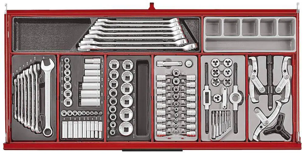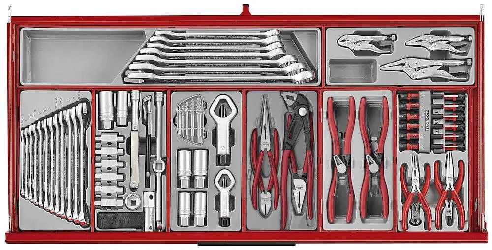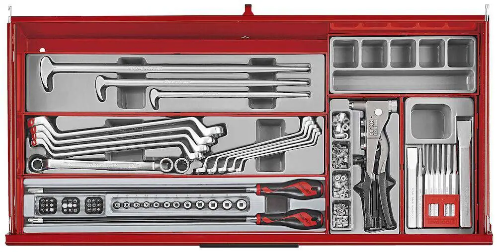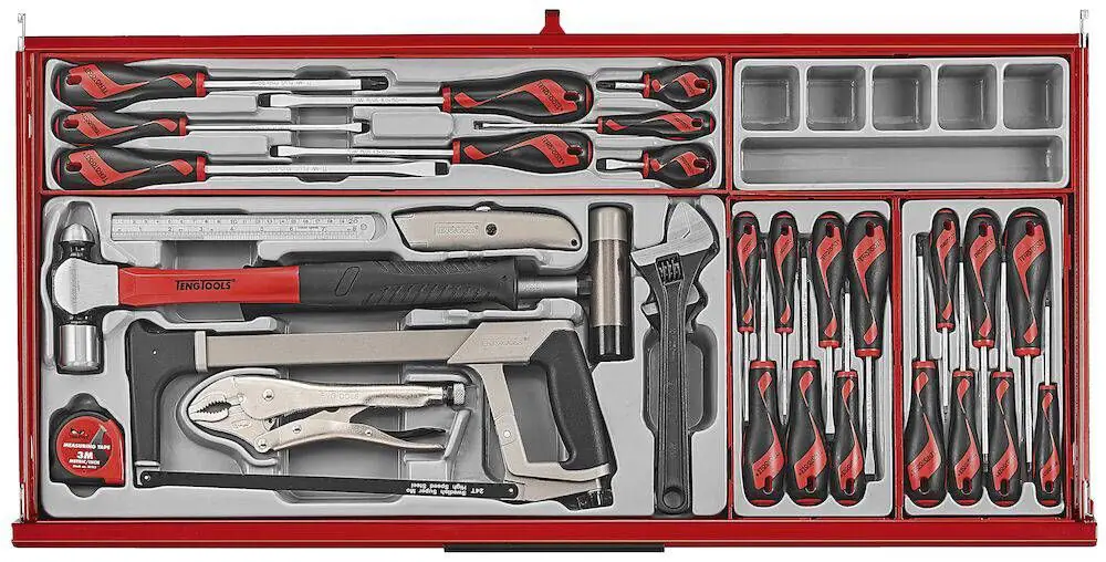 Zestaw narzędzi TengTools 37″ PRO35™ 663-częściowy TKW37R663T w matowym czerwonym wykończeniu jest idealny dla profesjonalistów motoryzacyjnych, zapewniając wysokiej jakości, wszechstronne przechowywanie i szeroki wybór narzędzi do różnych zadań motoryzacyjnych. Narzędzia są umieszczone w szafce na kółkach TengTools 37″ PRO35™ model TSW37R7. Szafka ma 964 mm szerokości, 460 mm głębokości i 985 mm wysokości z zamontowanymi kółkami. Jest zbudowana z myślą o trwałości, z 3-częściową ramą ze stali o dużej grubości i 5-stopniowym procesem zapobiegania rdzewieniu bez fosforanów w celu zwiększenia odporności na korozję i długowieczności. Posiada siedem w pełni wysuwanych szuflad: pięć o wysokości 75 mm na standardowe narzędzia i dwie większe szuflady o wysokości 154 mm na cięższe przedmioty. Pierwsze pięć szuflad może pomieścić do 25 kg każda, a większe szuflady mogą pomieścić 40 kg każda. Każda szuflada ma prowadnice kulkowe i tłumiącą hałas, ochronną matę EVA. Zestaw narzędzi zawiera narzędzia w sześciu z siedmiu szuflad, pozostawiając dużo miejsca na dodawanie narzędzi w razie potrzeby. Zestaw narzędzi zawiera niezbędne narzędzia do prac motoryzacyjnych: nasadki napędowe 1/4″, 3/8″ i 1/2″, nasadki bitowe, grzechotki, narzędzia udarowe, klucze płasko-oczkowe, śrubokręty, bity, klucze imbusowe i trzpieniowe z uchwytem T, szczypce, klucze dynamometryczne, ściągacze, gwintowniki i narzynki, klucze calowe i nasadki oraz różne narzędzia ogólne. System kontroli narzędzi TengTools zapewnia metodyczną organizację narzędzi, co ułatwia identyfikację brakujących lub źle umieszczonych narzędzi. Wózek ma otwory na akcesoria po obu stronach, co zapewnia dodatkową personalizację. Przyjazny dla użytkownika 3-cyfrowy zamek szyfrowy zabezpiecza wszystkie szuflady jednocześnie, eliminując potrzebę używania kluczy, które można zgubić lub skopiować. Mobilność zapewniają 2-calowe, wytrzymałe kółka, w tym dwa 5-calowe kółka obrotowe z hamulcem i dwa 5-calowe kółka stałe, uzupełnione o wygodny uchwyt z boku wózka. Zestaw zawiera również trwały blat roboczy z laminowanej płyty MDF o grubości 18 mm.