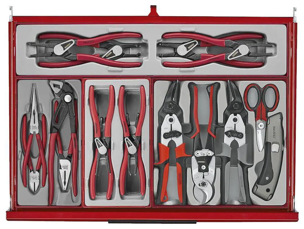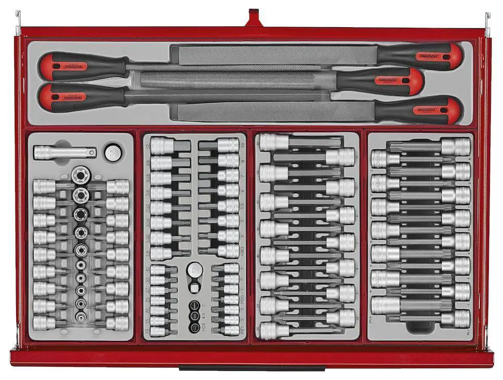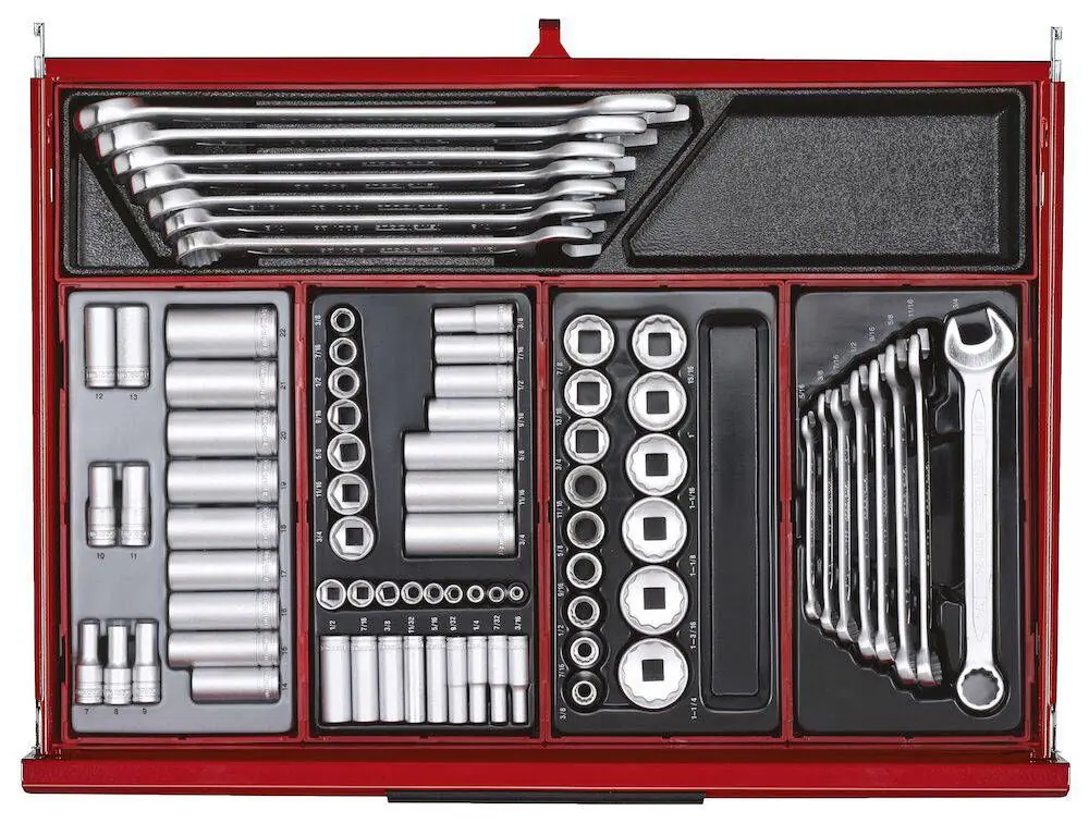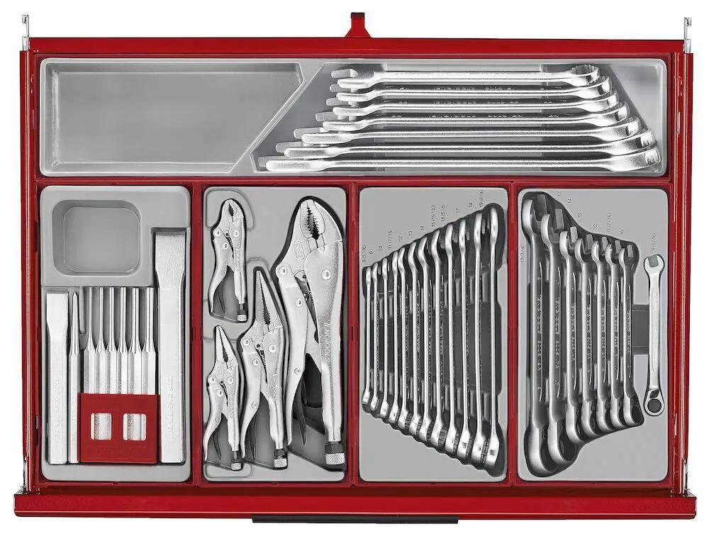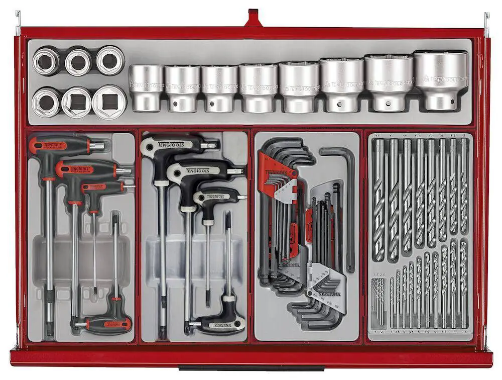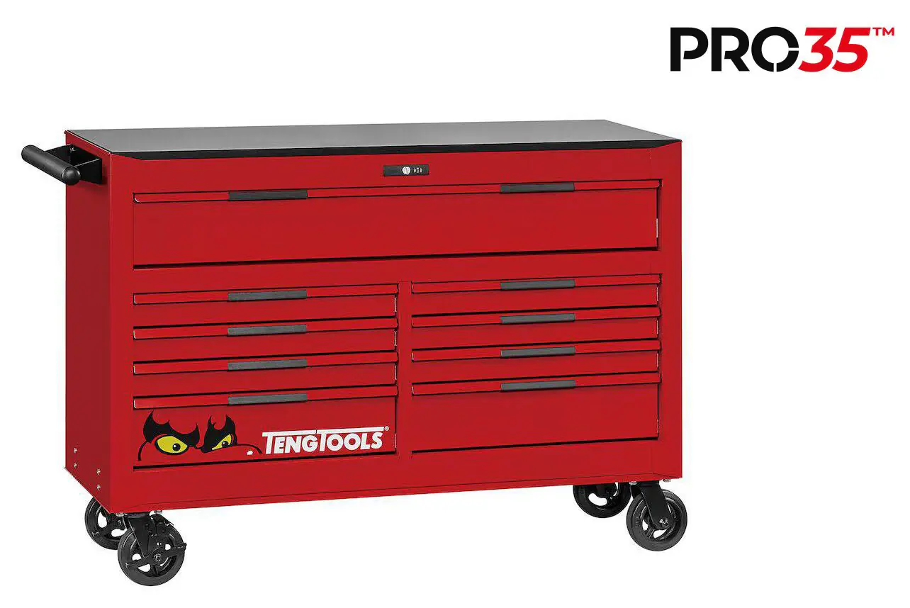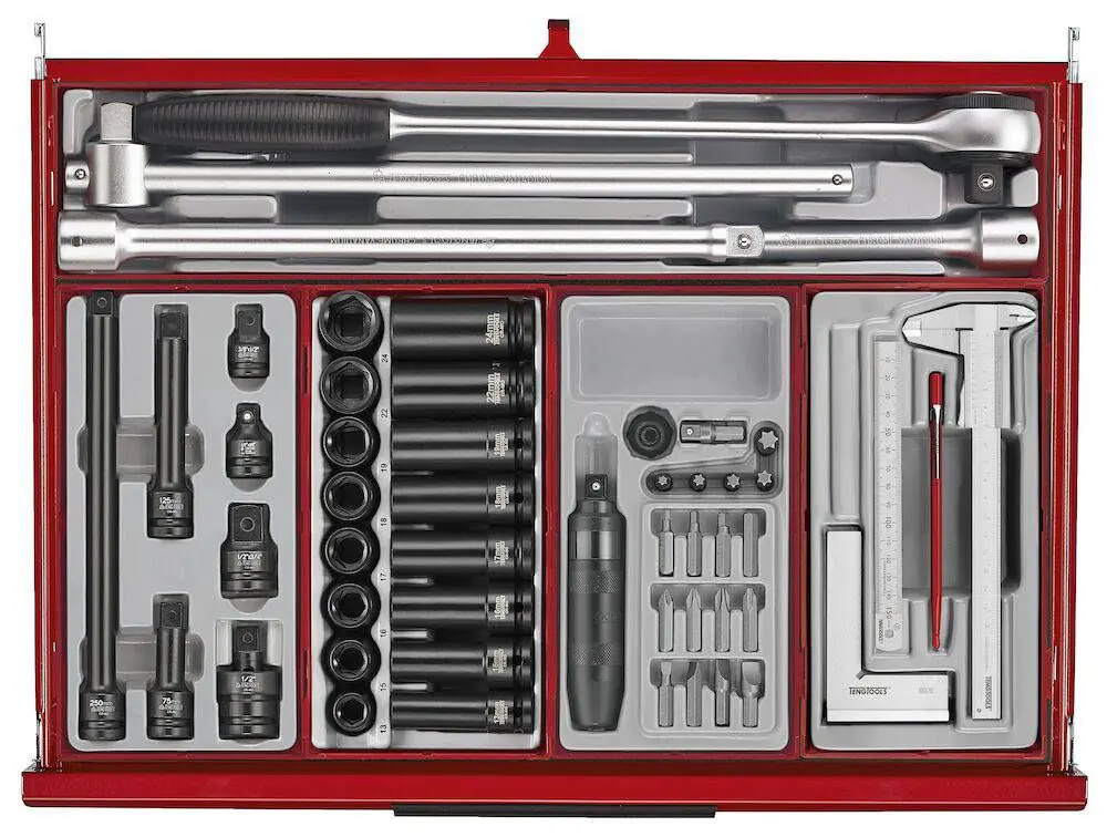 Zestaw narzędzi do szafki na kółkach TengTools 53″ PRO35™ TKW53R615T w matowej czerwieni został stworzony, aby sprostać potrzebom profesjonalistów z branży. Zestaw narzędzi zawiera 615 trwałych elementów o różnorodności, która czyni go atutem w szerokim zakresie środowisk przemysłowych. Głównym elementem zestawu narzędzi jest szafka na kółkach TSW53R9 o szerokości 1350 mm, głębokości 460 mm i wysokości 813 mm, rozszerzalna do 983 mm z kółkami. Dziewięć w pełni wysuwanych szuflad zapewnia dużo miejsca do przechowywania. Sześć szuflad ma wysokość 75 mm, dwie szuflady mają wysokość 154 mm, a większa górna szuflada ma wysokość 160 mm na większe przedmioty. Każda szuflada może utrzymać do 40 kg. Zestaw narzędzi jest wyposażony w różnorodny zestaw narzędzi niezbędnych do prac przemysłowych, w tym nasadki napędowe 1/4, 3/8, 1/2 i 3/4, nasadki bitowe, grzechotki, narzędzia udarowe, klucze płasko-oczkowe, śrubokręty, bity, klucze imbusowe i trzpieniowe z uchwytem w kształcie litery T, szczypce, klucze calowe, nasadki calowe, ściągacze i inne narzędzia ogólnego przeznaczenia. Narzędzia te są starannie zorganizowane w dedykowanych modułach jako część systemu kontroli narzędzi TengTools, zapewniając uporządkowane miejsce pracy i ułatwiając szybką identyfikację wszelkich brakujących lub pozostawionych narzędzi. 3-częściowa konstrukcja ramy stalowej szafki o dużej grubości gwarantuje jej odporność na trudy użytkowania przemysłowego. Jest ona dodatkowo wzmocniona 5-stopniowym procesem zapobiegania rdzewieniu bez użycia fosforanów. Każda szuflada jest wyposażona w prowadnice łożyskowe i wyłożona matą EVA w celu ochrony narzędzi i zmniejszenia hałasu. Aby ułatwić przemieszczanie i zapewnić stabilność, szafka na kółkach została wyposażona w cztery wytrzymałe 6-calowe kółka obrotowe, z których dwa są hamowane. 3-cyfrowy zamek szyfrowy utrudnia osobom nieupoważnionym dostęp do narzędzi znajdujących się w środku. Szafka na kółkach ma otwory po obu stronach do montażu akcesoriów, co zapewnia większe możliwości personalizacji. W zestawie narzędzi znajduje się uchwyt na papier (TCA08), a także 18-milimetrowy laminowany blat roboczy z płyty MDF, który zapewnia trwałą i praktyczną powierzchnię roboczą.