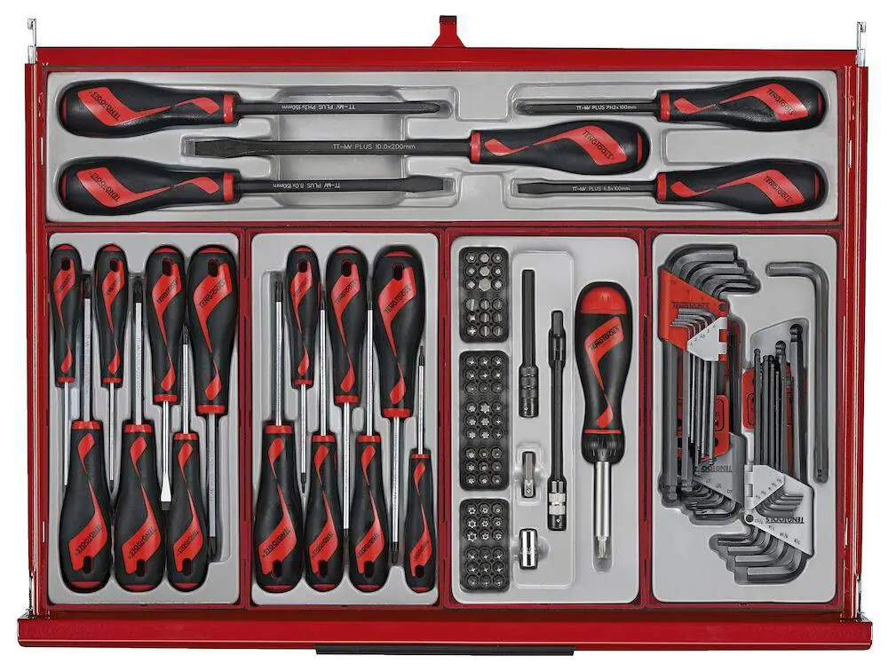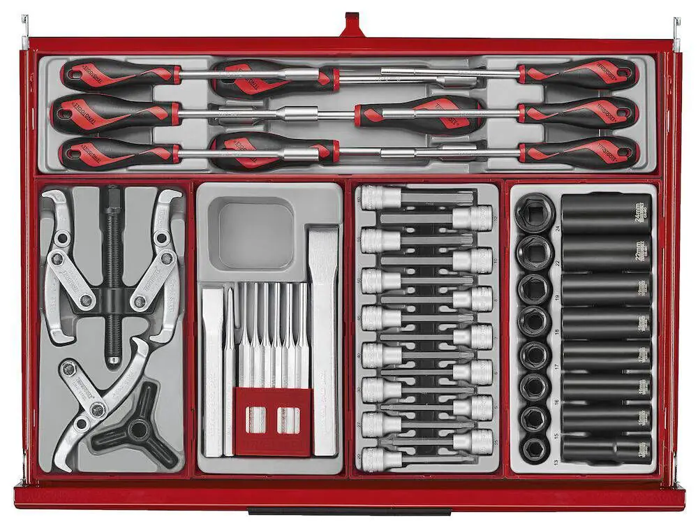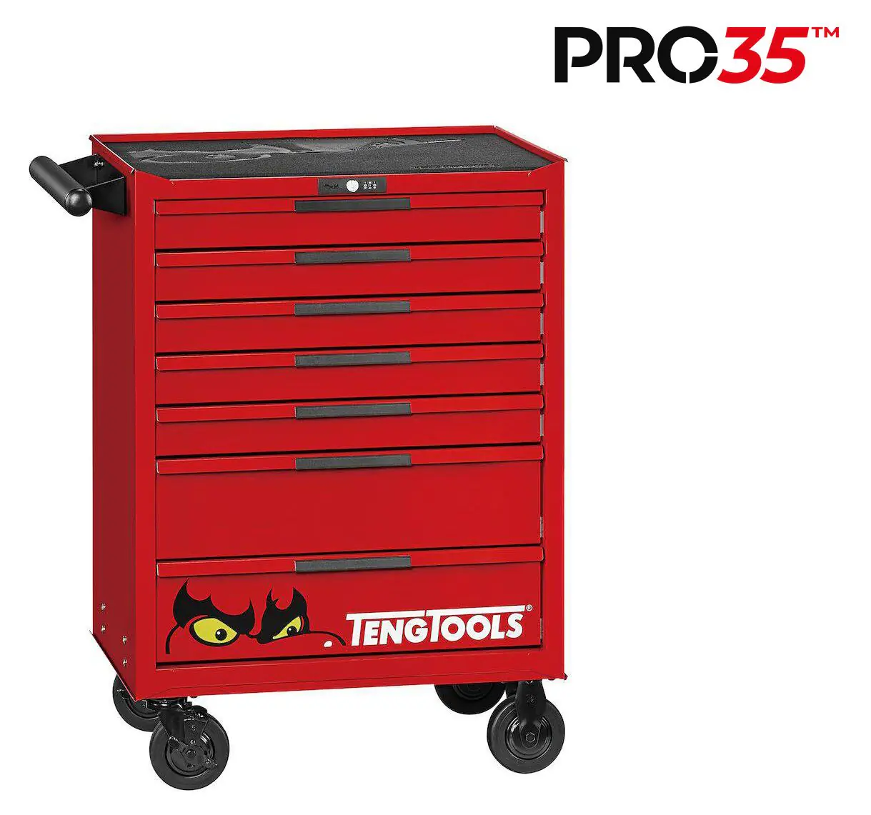 Zestaw narzędzi TengTools 26″ PRO35™ TKW26R628T w matowej czerwieni to wszechstronny i solidny zestaw narzędzi składający się z 628 elementów, przeznaczony dla profesjonalistów w różnych zastosowaniach przemysłowych. Zawiera szeroki wybór narzędzi przeznaczonych do użytku przemysłowego, w tym 12-kątne nasadki z napędem kwadratowym 1/4″, 3/8″ i 1/2″, nasadki bitowe, grzechotki, narzędzia udarowe, klucze płasko-oczkowe, śrubokręty, bity, klucze imbusowe i TX z uchwytami T, szczypce, pilniki, ściągacze, narzędzia do skrobania i inne narzędzia ręczne. Wszystkie narzędzia są umieszczone w modułach, które są częścią systemu sterowania narzędziami TengTools, co sprzyja uporządkowaniu miejsca pracy i ułatwia szybką identyfikację brakujących narzędzi. Szafka na kółkach TSW26R7 ma 680 mm szerokości, 460 mm głębokości i 960 mm wysokości z zamontowanymi kółkami. Posiada siedem w pełni wysuwanych szuflad: pięć szuflad o wysokości 75 mm i dwie większe szuflady o wysokości 154 mm. Każda szuflada jest wyposażona w płynnie działające prowadnice kulkowe i matę EVA redukującą hałas, która chroni narzędzia i zmniejsza poziom hałasu. Każda szuflada ma ładowność do 40 kg. Mata EVA o grubości 5 mm jest dołączona do górnej powierzchni szafki na kółkach. Aby ułatwić przesuwanie, szafka jest wyposażona w dwa 5-calowe kółka obrotowe z hamulcem i dwa 5-calowe kółka stałe, a także uchwyt zapewniający wygodę. Nad szufladami z przodu szafki znajduje się 3-cyfrowy zamek szyfrowy, który zabezpiecza wszystkie szuflady. Szafka ma również otwory na akcesoria po obu stronach. Zestaw zawiera uchwyt na rolkę papieru (TCA08).