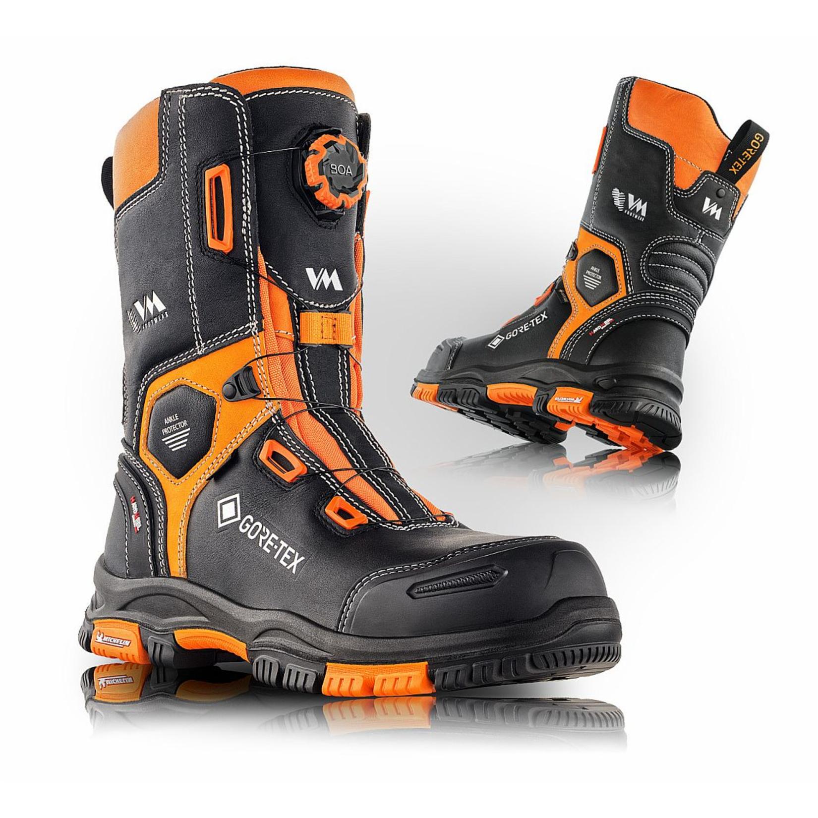 Wysokie trzewiki ochronne z podnoskiem kompozytowym i kevlarową wkładką antyprzebiciową w podeszwie. Skóra hydrofobowa, Membrana GORE-TEX®, powered by BOA® Fit System, MICHELIN® Technical Soles VM FOOTWEAR CONNECTICUT S7L FO HRO AN SR BOA